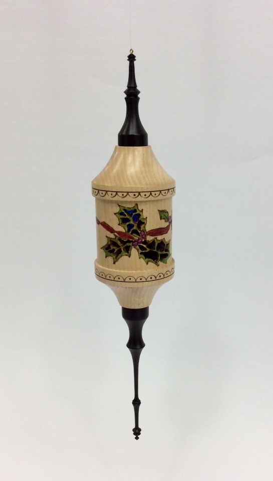 I turned the ornament/finials and after Robin drew the holly leaf design, I pierced the leaf openings.