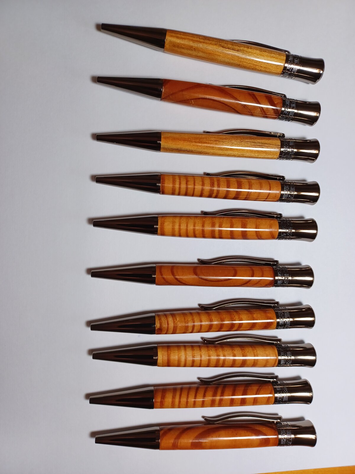 Just before Covid hit we moved my ailing parents to an assisted living facility near us (they were previously 4 hours away). A large portion of their 4 bedroom house resides in our basement (most of it in my workshop). With the additional time taken to care for my Mom (Dad passed early on from Covid) I haven't been in the workshop much until this summer. I turned a couple JohnU blanks - snake skin, and my favorite candy (always a joy to turn his blanks). Finished off some pens for a friend. He bought an old run-down Carnegie library and with the intent to rehab it into some office space and a restaurant. These were made from one of the old rafters. They were some of the hardest pens I have had to make! Old pine. The growth rings are very hard, they chip pretty easily, so I would soak them with CA and turn a little off, then soak with CA again . . . . And sanding was nearly impossible. The growths rings are so hard they would barely sand and the soft wood would fly off, so I ended up with a very wavy feeling pen. Ended up having to turn them smooth with a square end carbide tool and not touch them with sand paper. I still have 10 more waiting to finish turning. But was nice to get back into the workshop. (Also built a desk with my son, which was a really good time)