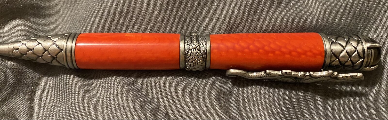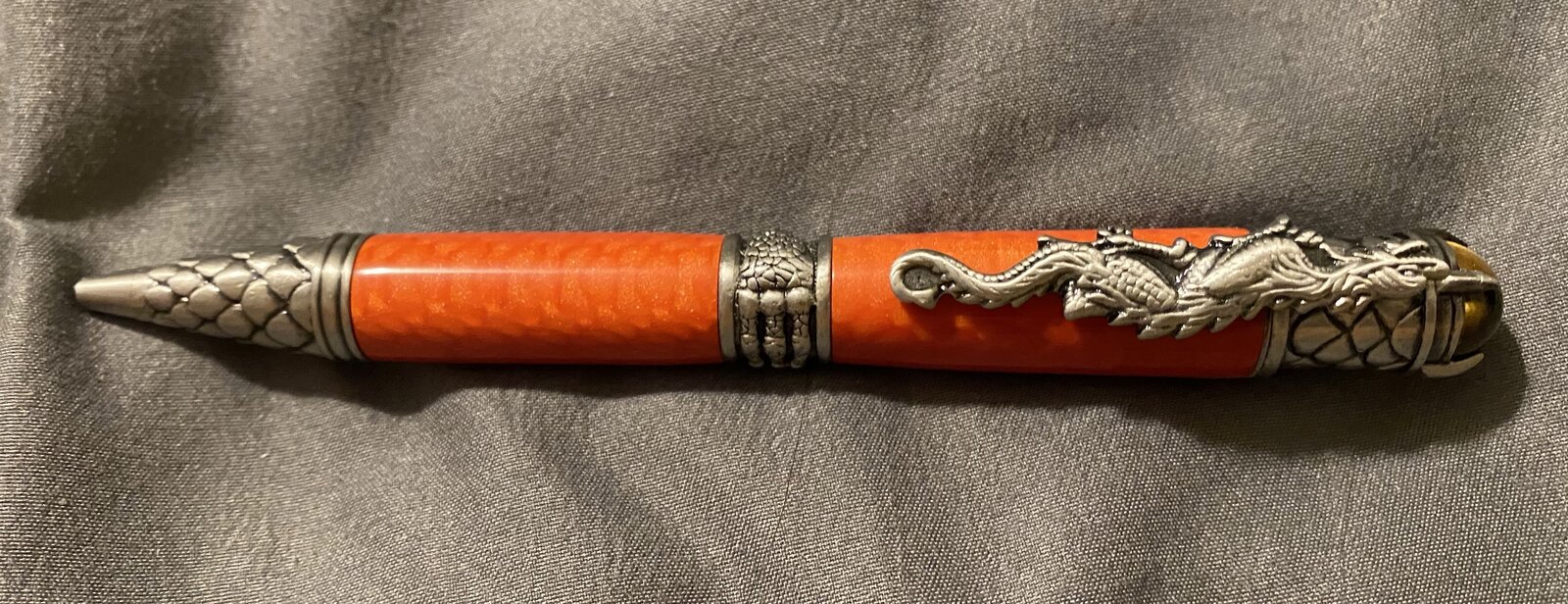 Monday my youngest got to ring the bell following his cancer treatments (again). This was his second go round with Langerhan's Cell Histiocytosis. The boy loves orange and dragons. So, I made him a Dragon pen (PSI) with an Orange Juma blank. I purchased both from exotic blanks. Dawn and Ed have always been very good to me. As to the kit, not my favorite, but he loves it. That is what matters. If you asked me what is my main concern about the kit, I would say the following. 1. The bushings mean very little. If you use them and want a good fitment, you will likely be disappointed. 2. If the centerband gets turned around it causes the upper barrel to not seat all the way. If there is a warning about it in the instructions I didn't see it.