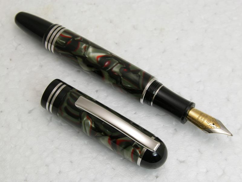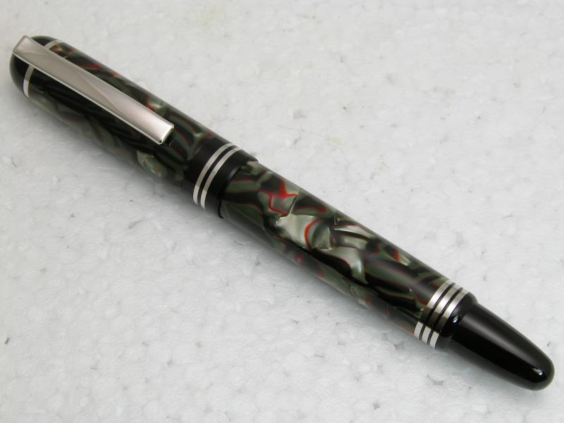 This is a piece of Italian Serpentine cebloplast by Mazzucchelli on a rhodium Churchill fountain pen. I really like how the material blends with this kit.