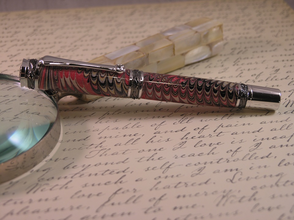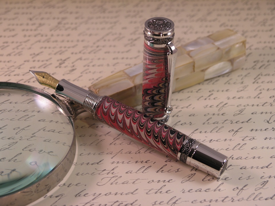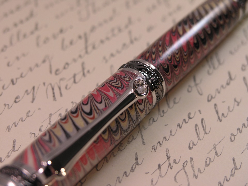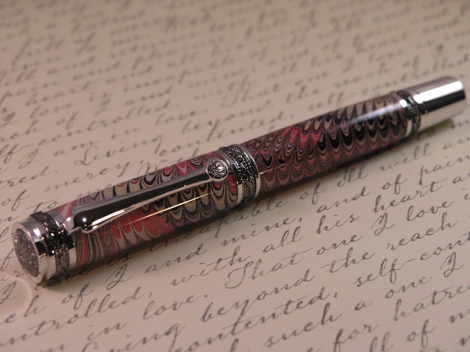 I just put together a Majestic in an Italian Marble Paper blank, and wanted to share. This paper that this blank is made from was created by a Brazilian artist named Renato Crepaldi, who does some wonderful work in the traditional style as well as some interesting updating of the art. The blank was created by Mark Koster, Hobble Creek Craftsman, who has been an absolute joy to work with. I highly recommend him as a source, he is a real asset to our community.