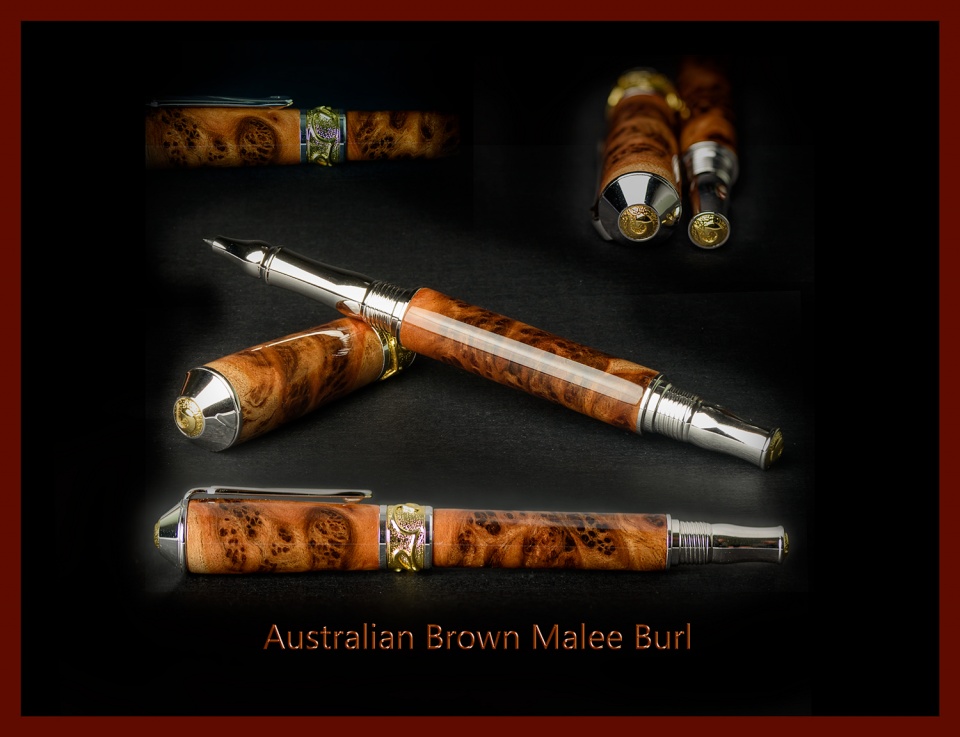 I've had this wood and pen laying around for a couple years. I think the Burl is brown mallee. Unfortuanately the pen kit has a flaw in the cap that I didn't notice until I took pictures. I suppose it's too late to do anything about it now. I don't even remember which vender I bought it from. Thanks for looking.
