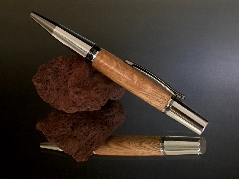 That line is from the Shawshank Redemption. As many others here have done, I ordered some of the wood from the Shawshank Redemption oak tree. I read the post from Magic Bob the other day about the problem he had with his wood, and the various suggestions on how to avoid it. As a result, I dried my blank in a toaster oven at 185 degrees for 24 hours. After it cooled, I drilled it and turned it. It turned and finished nicely with no problems. Thanks to all for the suggestion! It was mated with an Aero kit.