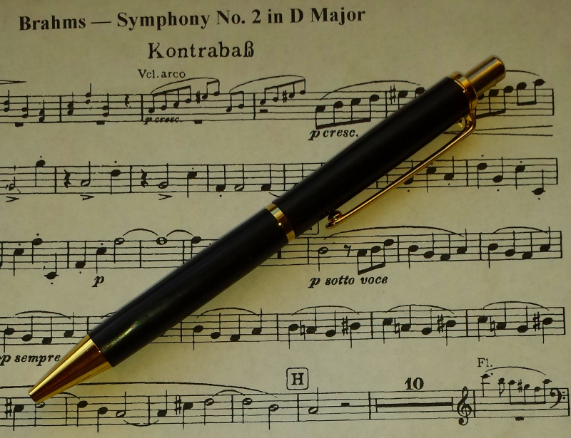 My daughter is finishing up her college career at Colorado University at Boulder where she received a full tuition and fees scholarship to play the upright bass. After her sophomore year it was time to replace her bass. They offered to put a cutout in the ebony finger board. (See first picture) Since they were just going to throw away the cutoff, I asked if I could have it. It wasn't very thick, but thick enough to make this click pen, which she requested.