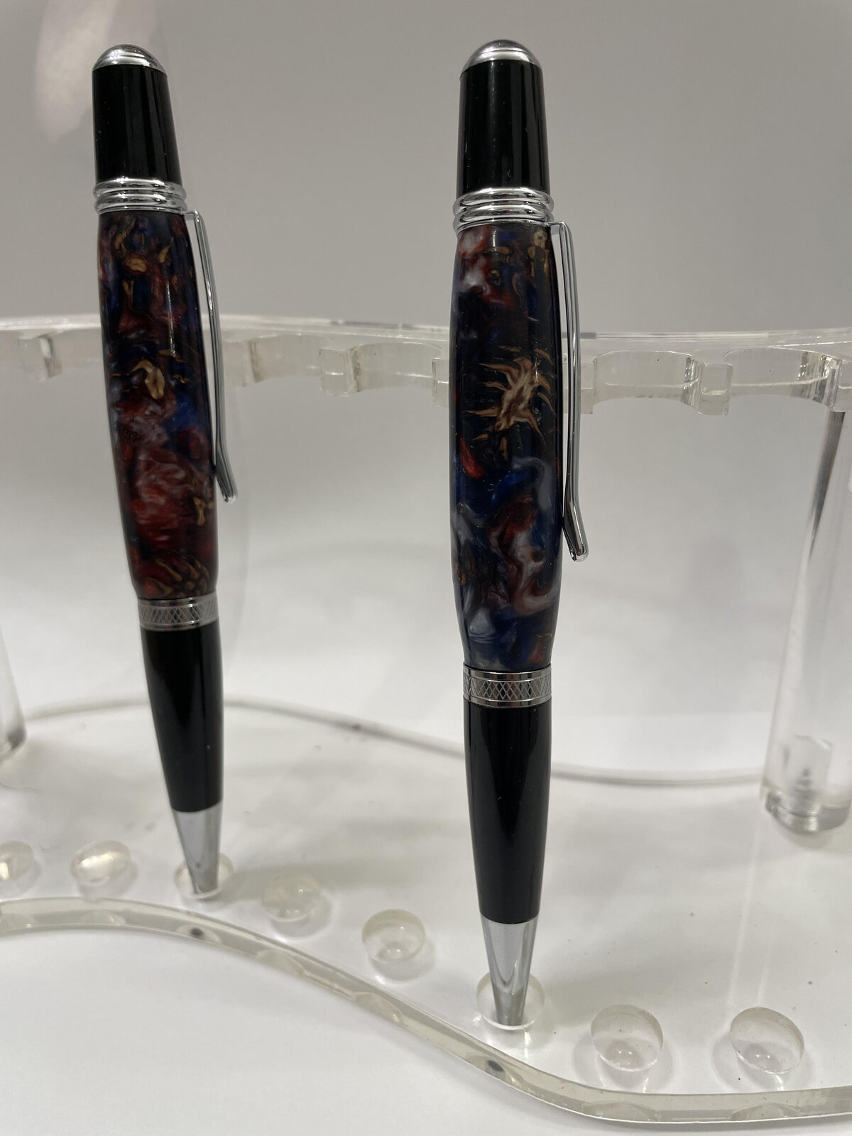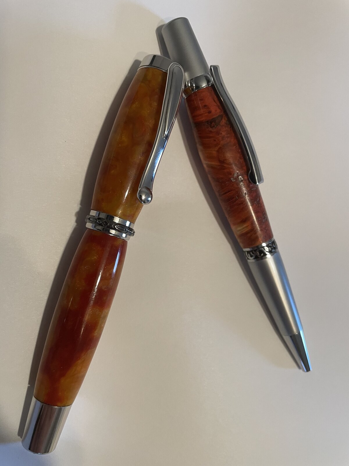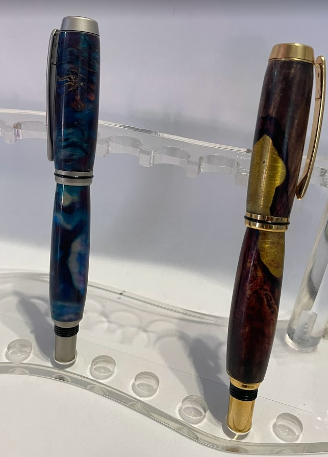 Last night I turned the other two, (sorry for crappy pic) Jr Statesman in an OLD Acrilester (sp) blank in orangish color. Then a Pink dyed Box Elder Burl Sierra.