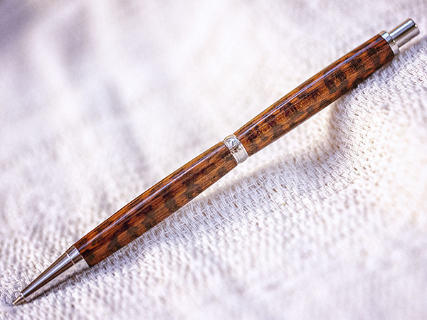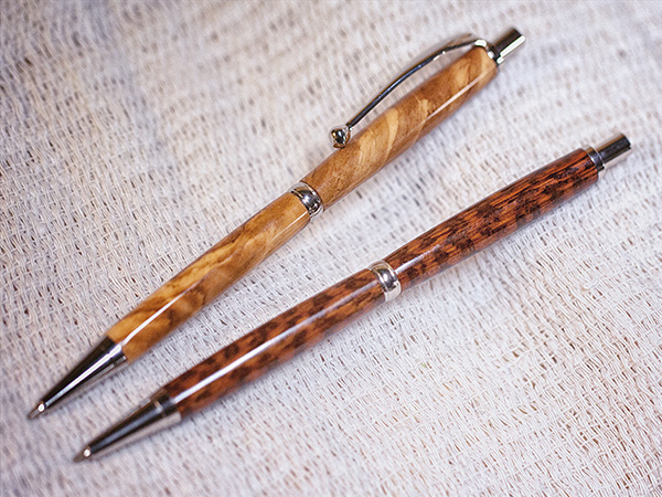 Checking (again) if I can still turn slimline, I dug two half-inch blanks from the stash and get the ball rolling. One of the blanks was snakewood I've had for some time and with all the warnings I've read over the years, I started drilling very slowly and with frequent stops (it probably took 30 minutes for each half). The other blank was olivewood and I was much less cautious, I picked it for the smell anyway so a little heat helps dissipate the characteristic odor. Both glued with 5 minutes (Ape) epoxy, with overnight curing. Turning was uneventful, CA finishing as well, the assembly was a bit nerve-wracking for the snakewood but I managed.Since I didn't want to miss any future cracks that might appear I decided not to include the clip for the final assembly. Except I realized too late the I had forgotten to include the clip... oh well, not trying a disassembly on that one, I'll have to be careful that it doesn't roll off the desk. Mistake corrected for the olivewood pencil assembly