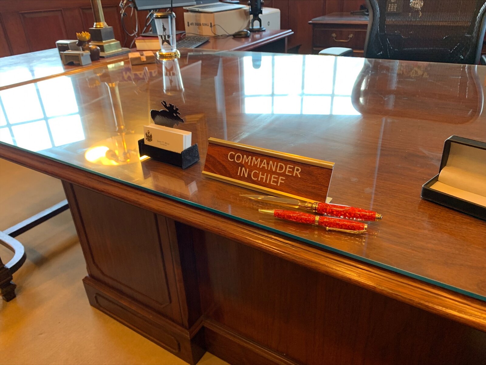 One of my crushed Lobster pens and letter opener on the Governor of the State of Maine's desk.