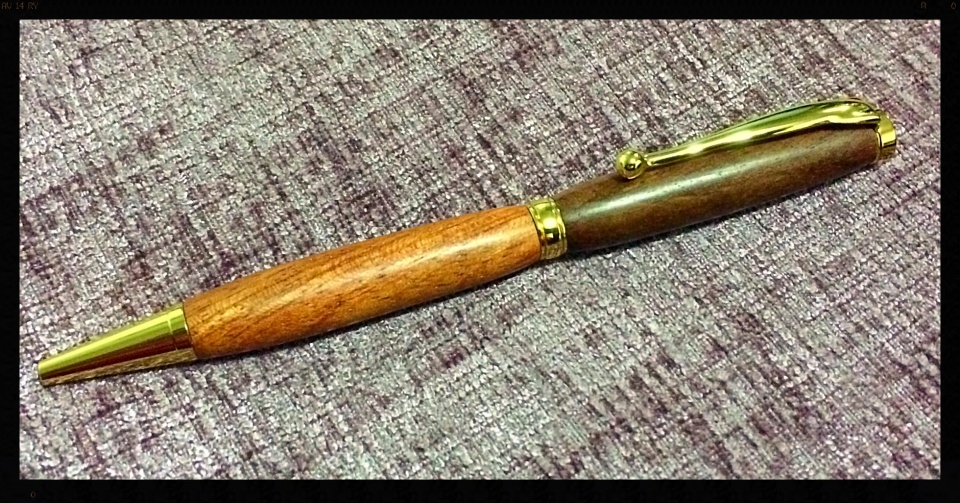 I used bubinga and African rose wood for this two tone slimline pen. This one took a long time to do as there was a lot of vibration and chattering. I'm not sure why that was. It made it very hard to get nice smooth cuts and the spindle gouge kept skipping. I spent ages sanding trying to get rid of the tool marks.
