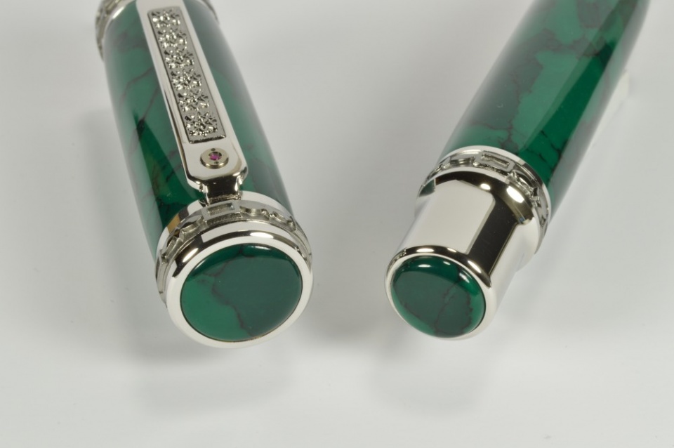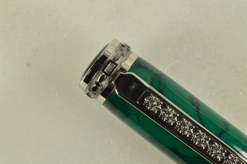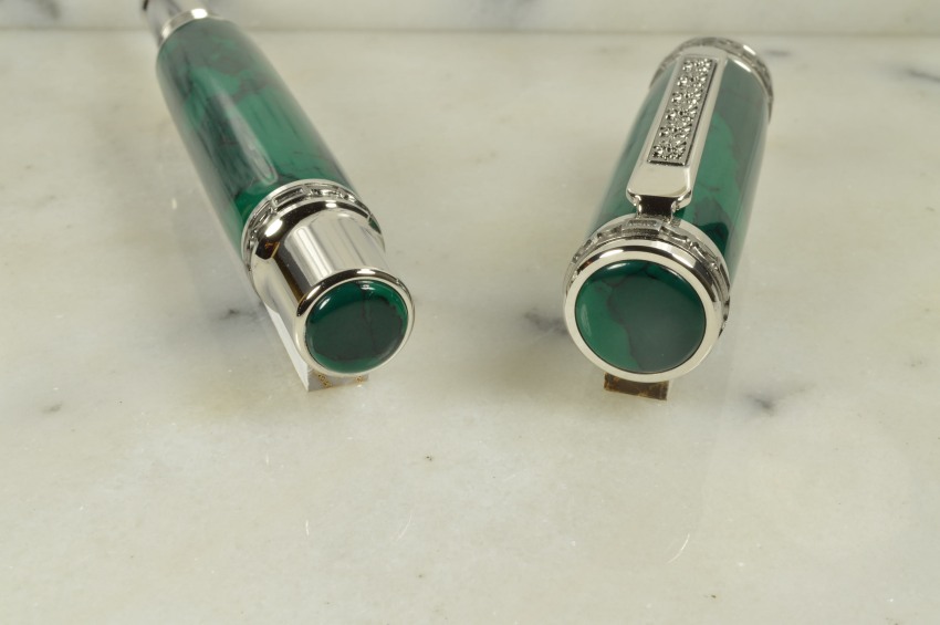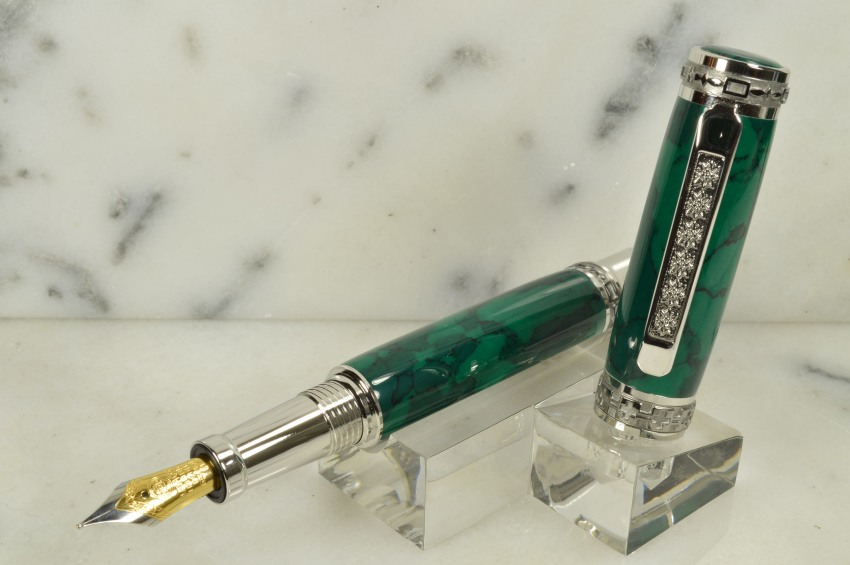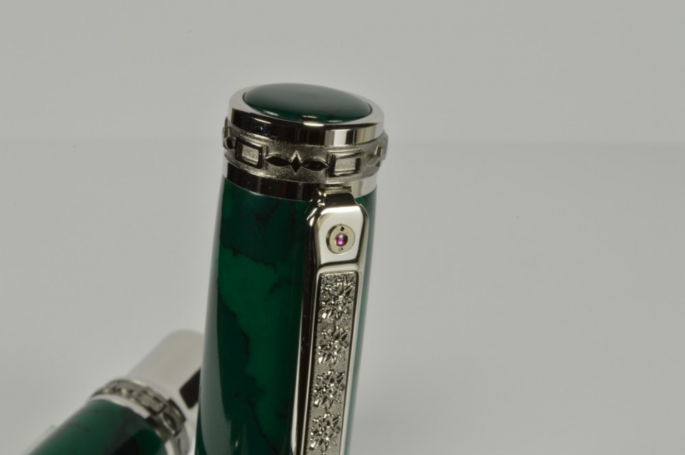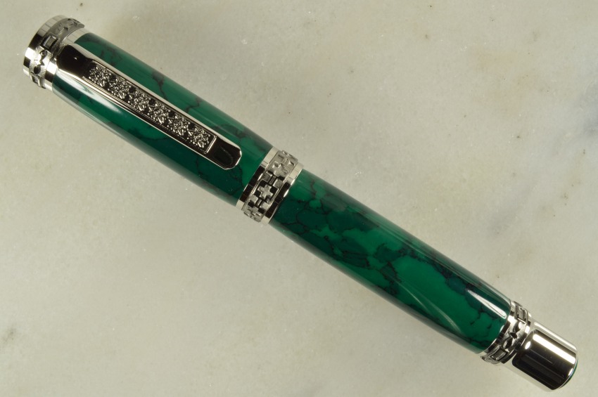 Hello everyone! Well I made this pen over the weekend with intentions of posting on my website. Its a full size emp in rhd/bt fountain pen. The Imperial Jade Tru-Stone barrels turned out absolutely gorgeous! I made custom finals for this pen on both cap and pen barrels. Got to start taking pix's of the pen and I'm still trying to figure out how the hell I missed it but there is an extremely small nick on the pocket clip! When I seen this I was P_ _ _ _ _! Anyway enough about that.