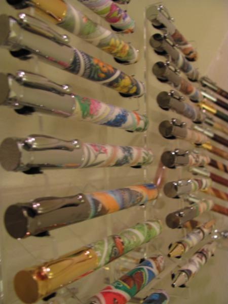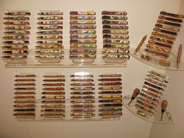I was running out of space having them sitting on things,so I found these nice acrylic shelves at the Container Store that match the racks nicely,and with the 2 corner units,I got my 100 pens displayed on a corner wall in the den.I enjoy looking at them,and will rotate them out,having my better ones replacing the less-so ones as I hopefully improve,and complete more down the road.