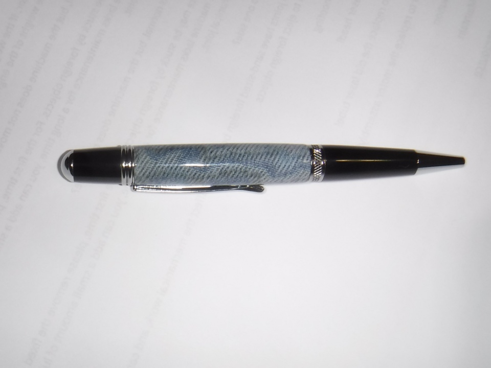 It has been a while since I have finished a pen. This one has been in process for a couple of years. Rolled up and stabilized some material from an old pair of work jeans. I think it turned out pretty well.