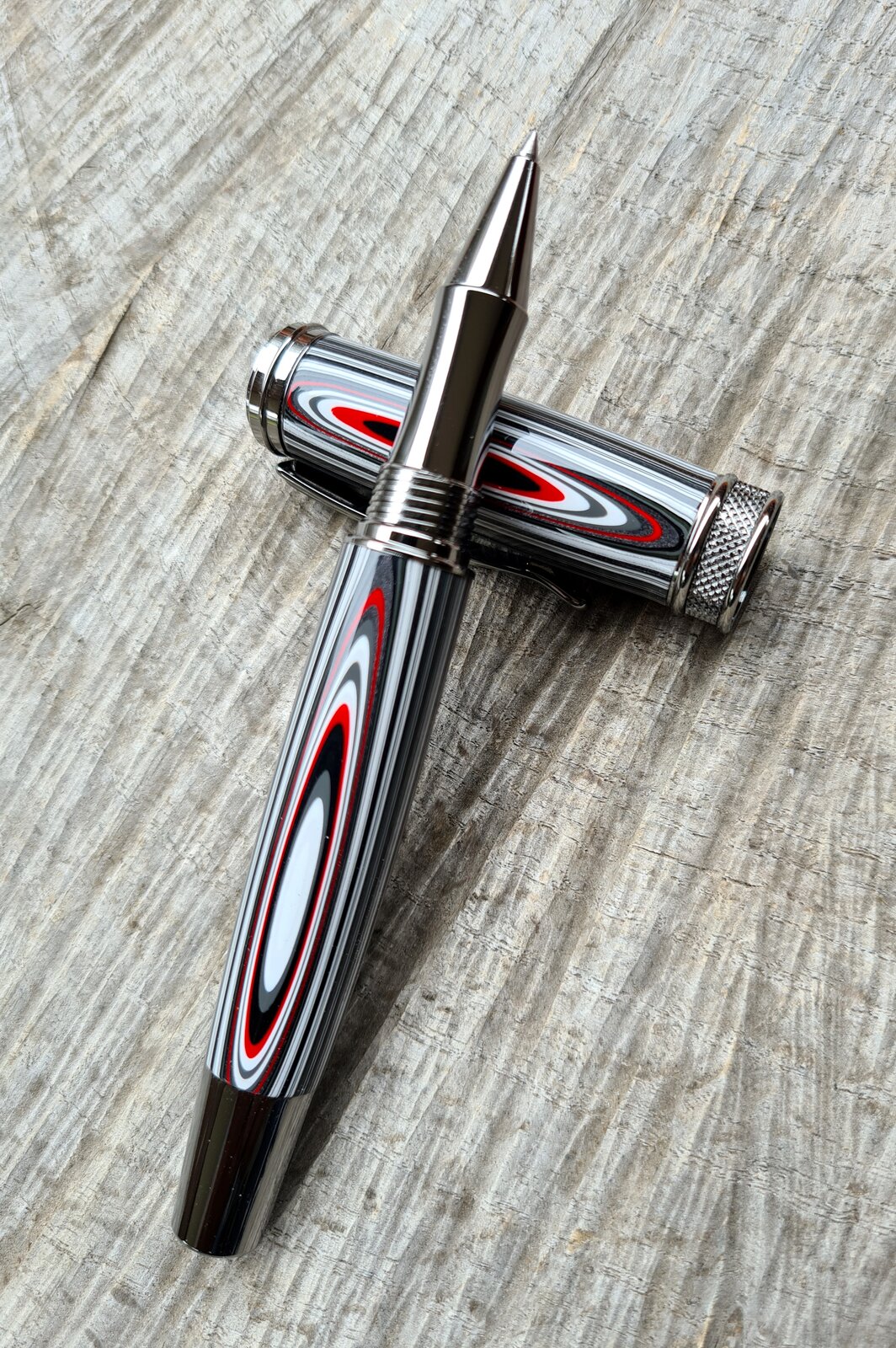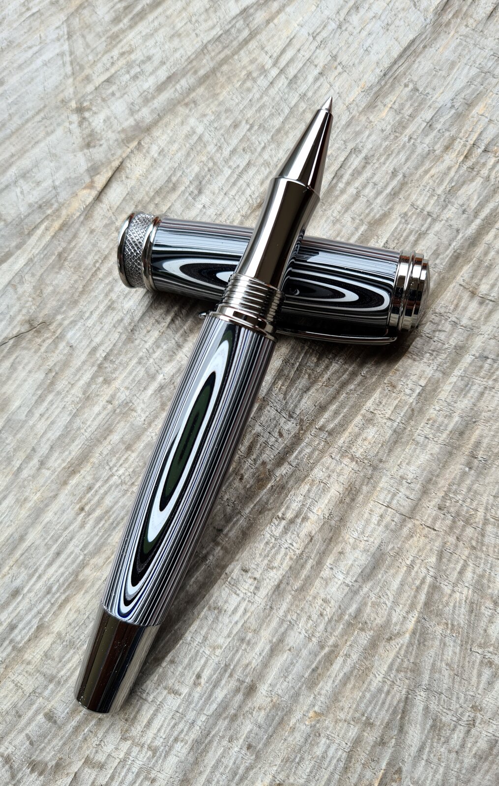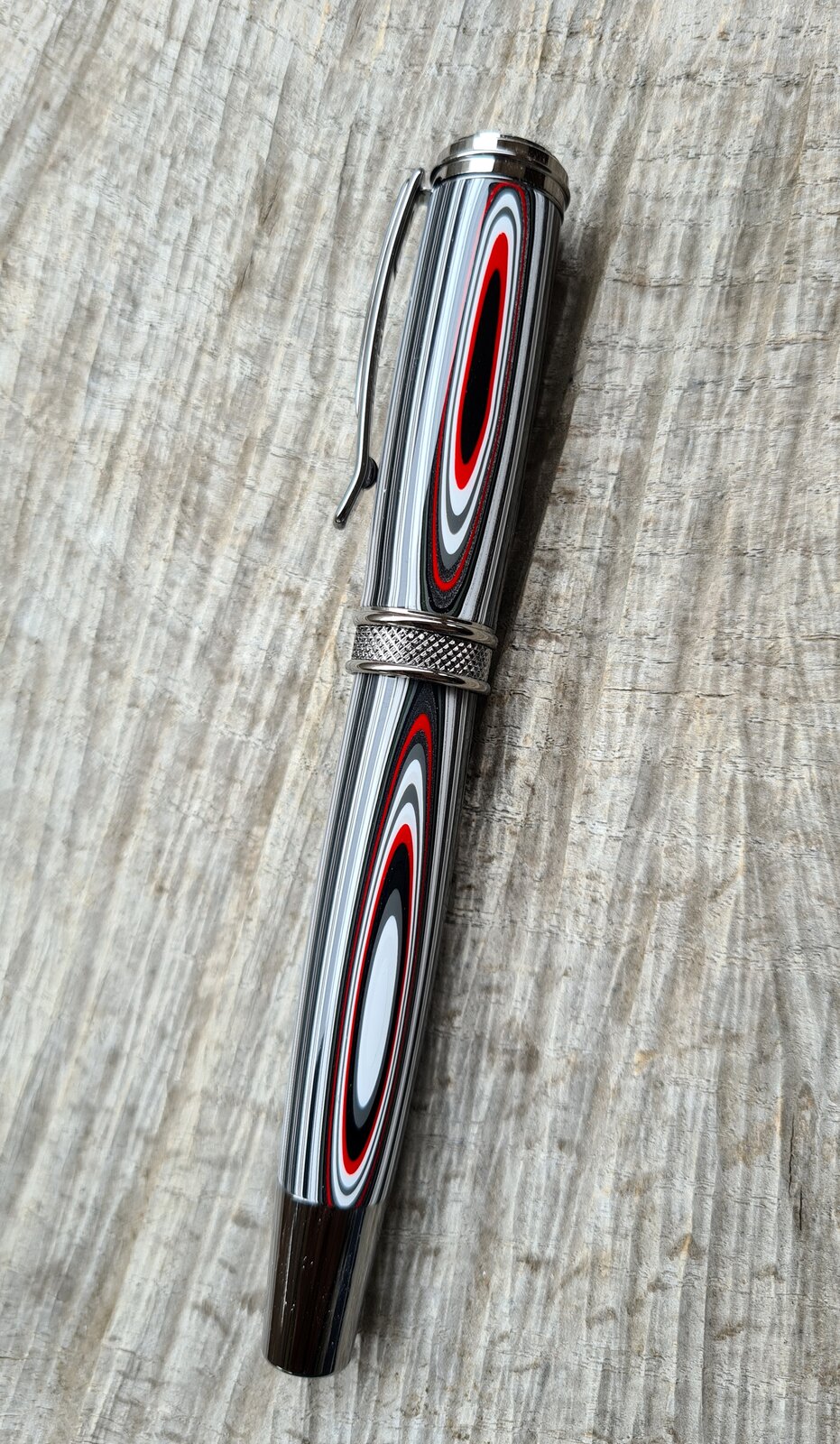 So I have been hoarding this fordite stuff for a few months now, and thought I'd spin some. It has lovely metallics in it, doesn't show in the photos. Modern Jeep on a Dayacom Harold black titanium rollerball. 8 coats of thin ca to protect it.