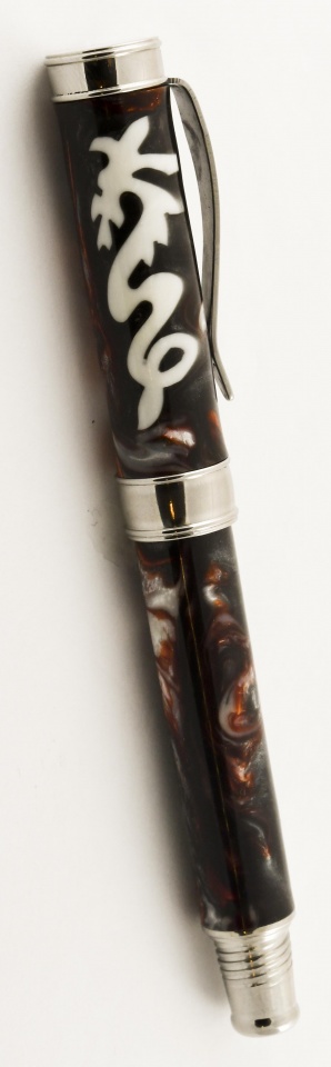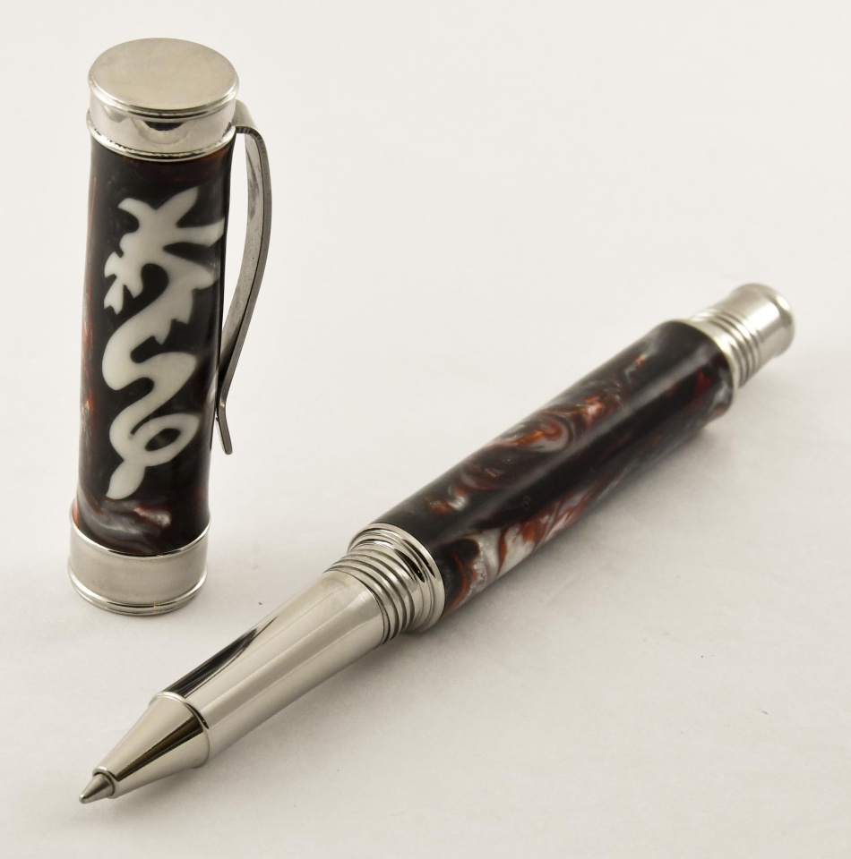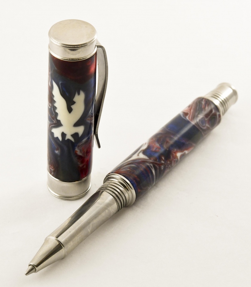 I finally got a chance to use some Raven component sets. These are pens with Jeff Powell's beautifully scroll-sawed Dragon and Patriotic Eagle blanks from Exotic Blanks on Lazerlinez Raven components. My patients really liked them. Had fun making them. Doc