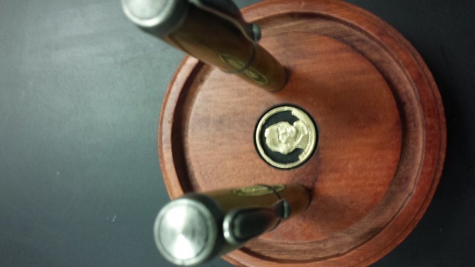 Set of antique silver Jr Georges with tulip poplar planted by Thomas Jefferson in 1807. Gold Jefferson dollar cut using jewelers fret saw. Made for CEO on his 25th anniversary with company.