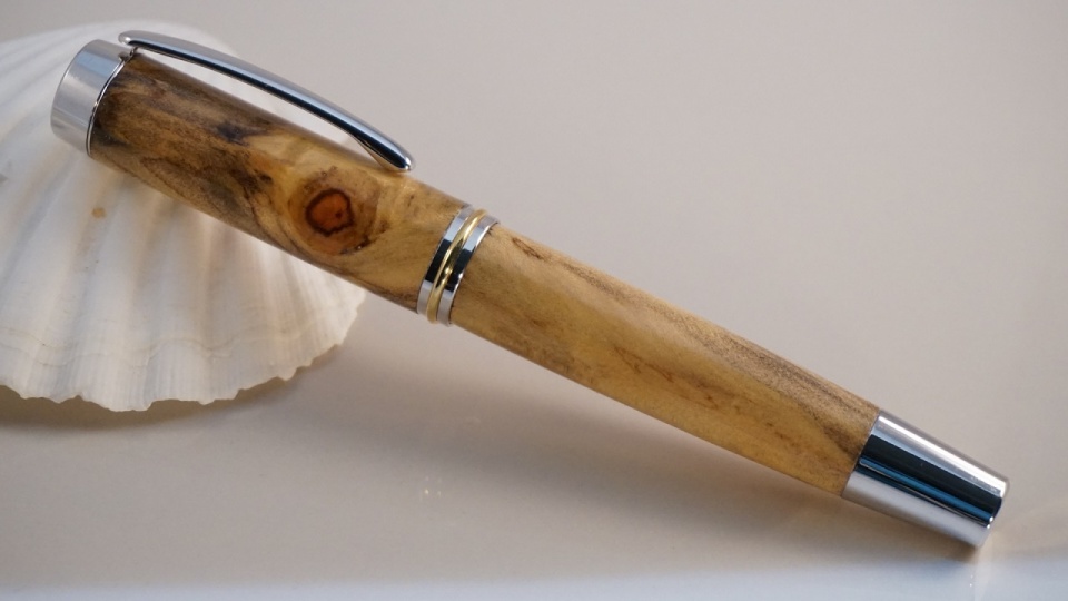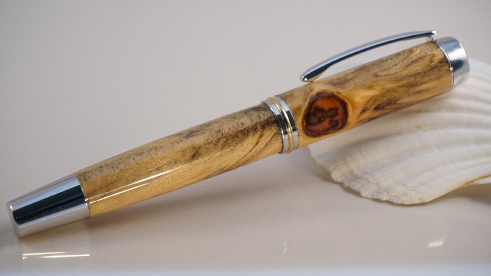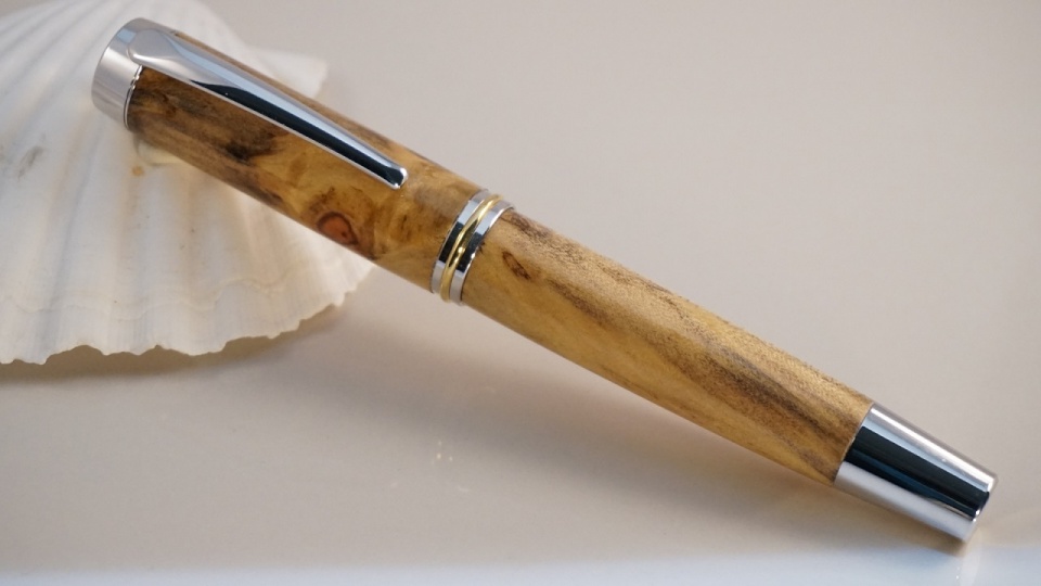 Some of you may have noticed that I primarily work in resins, it's what I enjoy doing, but I am also interested in woods that have character. I have done Snakewood, Curly Koa, Curly Mango, etc., and a couple of Joe Schneider's segmented blanks as well. A while back I received a couple of Joe's Norfolk Island Pine blanks and loved the knots and spalting enough to try them out. Here is the result. I think the color of the wood complements the Gentleman's Fountain Pen very well, but I would love to know what you think.