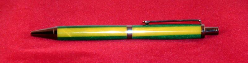 I hade this a few years ago, infact it was within the first 75 pens I ever made. Cut a green inlace blank and a yellow inlace blank and glued then together and then drilled a hole down the center.