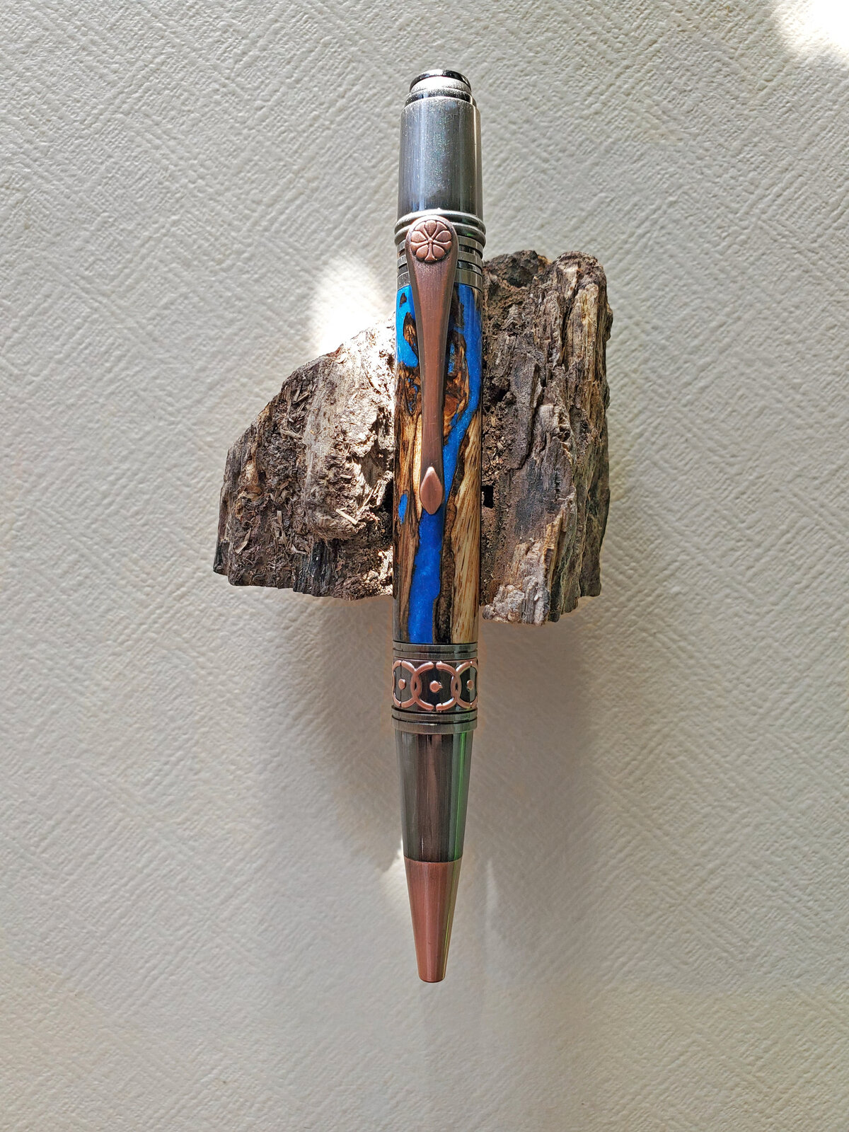 The cedar post was in pretty bad shape with a lot of voids due to weathering. So, I cut it up and cast it in blue resin to fill in the voids.