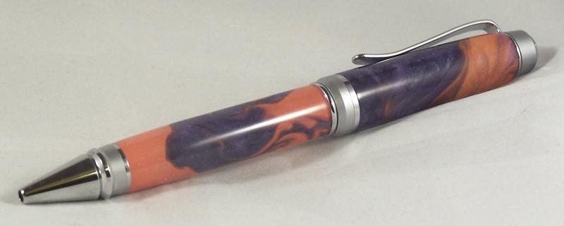This is a pen I made from Jonathon's (Brooks803) new clear swirl blank. The blank had a purple swirl and it was incapsulated in clear. I reverse painted it orange, cause them be the team I root for's colors. Comments welcome.
