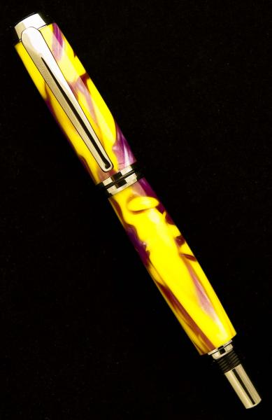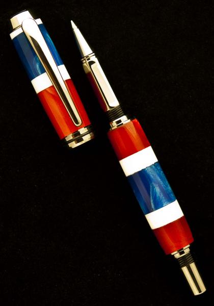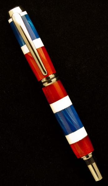 Jorge also used my leftovers from pen blanks and put together a segmented red white and blue pen on a Titanium Navigator kit. He also made his third one he called his LSU pen with school colors. He, as was my son, was extremely proud of his pens. He also asked if I would post them here so he would get feedback. It is really nice to watch young pen makers in the making. I am sure he would welcome comments and encouragement. Thank you for looking. Doc:smile: