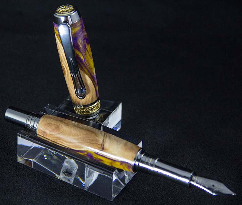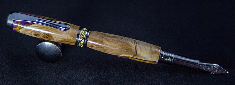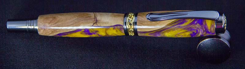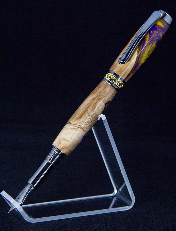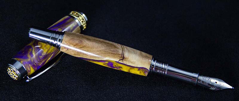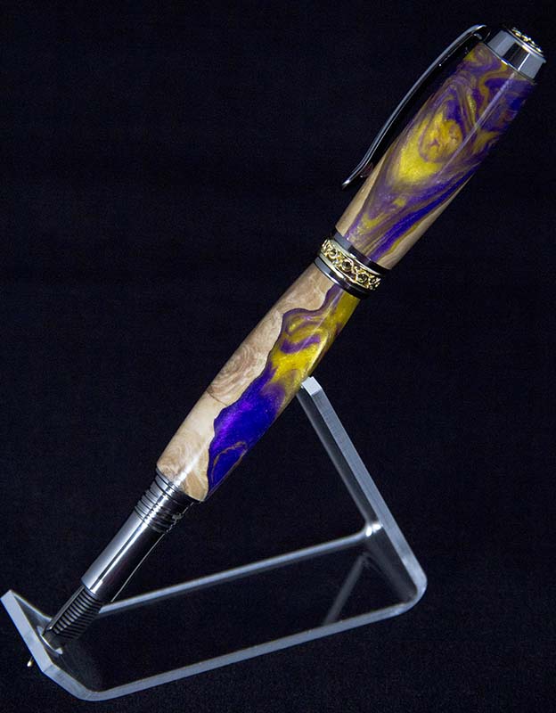 Here's a Jr. Antony Fountain Pen I did a couple weeks ago. I used a Figi Blank with LSU colors. Came out really nice, i did have one chip-out i had to fill with some sawdust and CA, but it just looks like part of the burl, so I'm happy about the way that turned out.