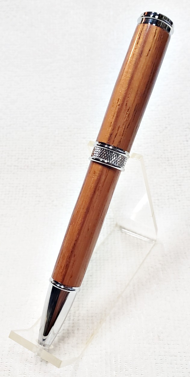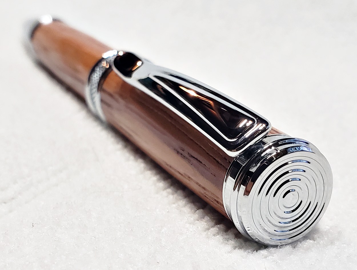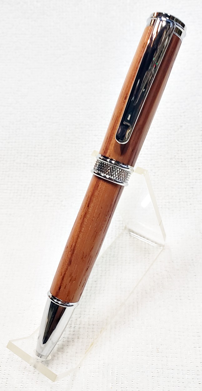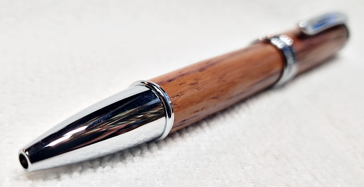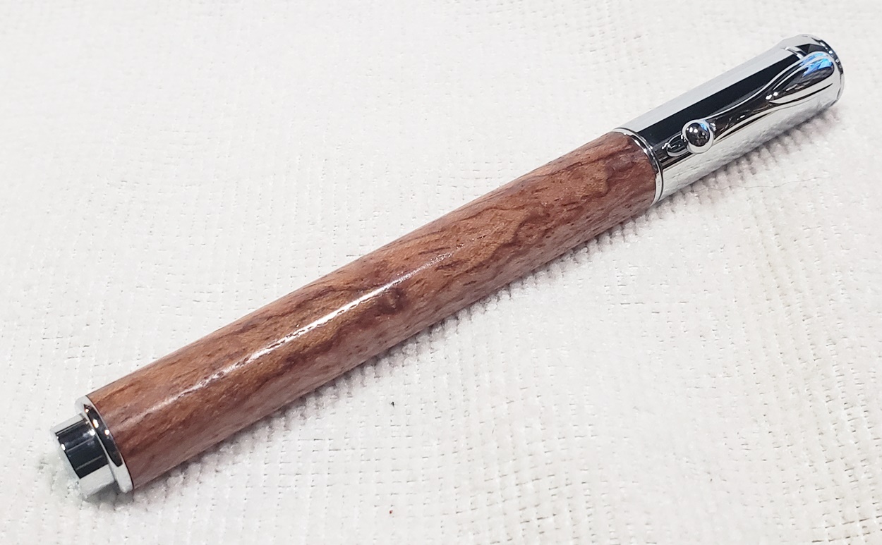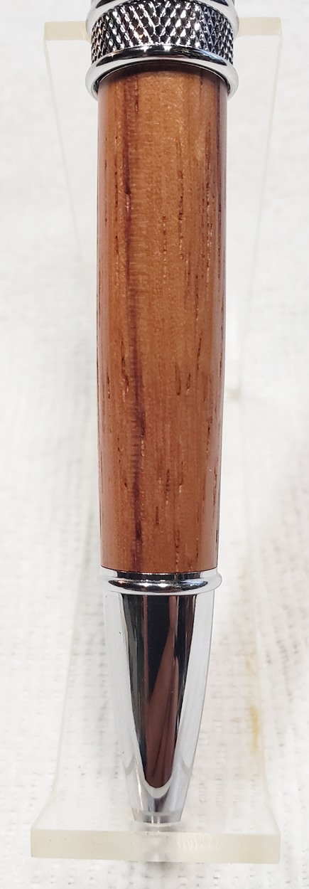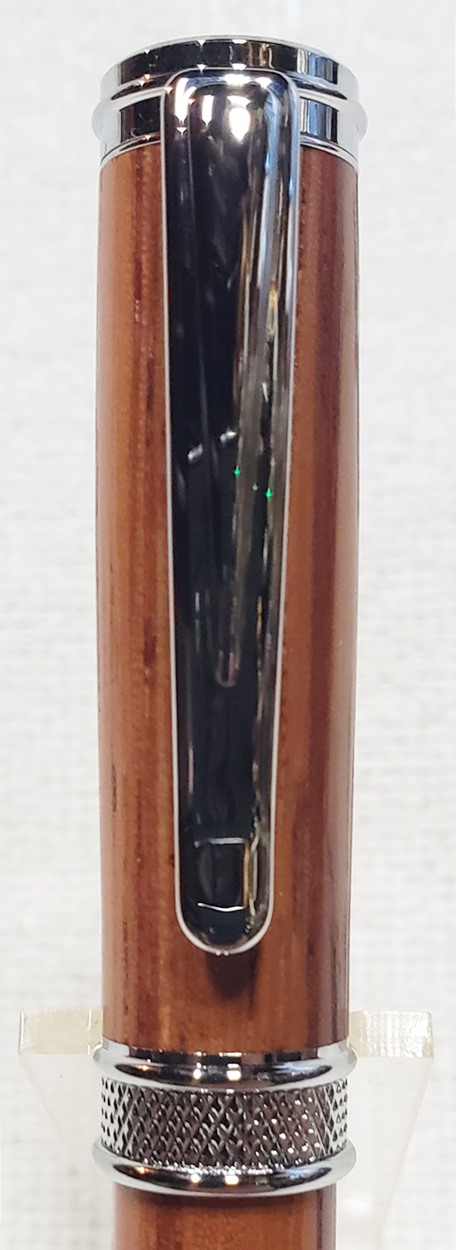 This is a new pen for me, called Jr. Edward, in chrome. It's a very large twist ballpoint pen, and is from Crooked Mill. I love it! I like all the design details like the clip, finial, center band, and tip. And I really like the wood with it. The wood is unknown, but very pretty. It smelled kind of sweet when I was turning it, so some kind of fruit wood, maybe? I'm keeping this one for myself! (I need another pen!)