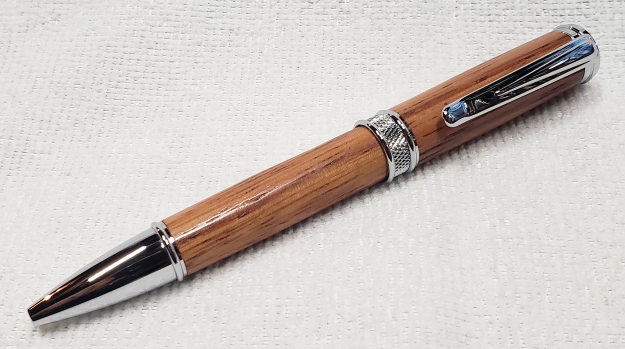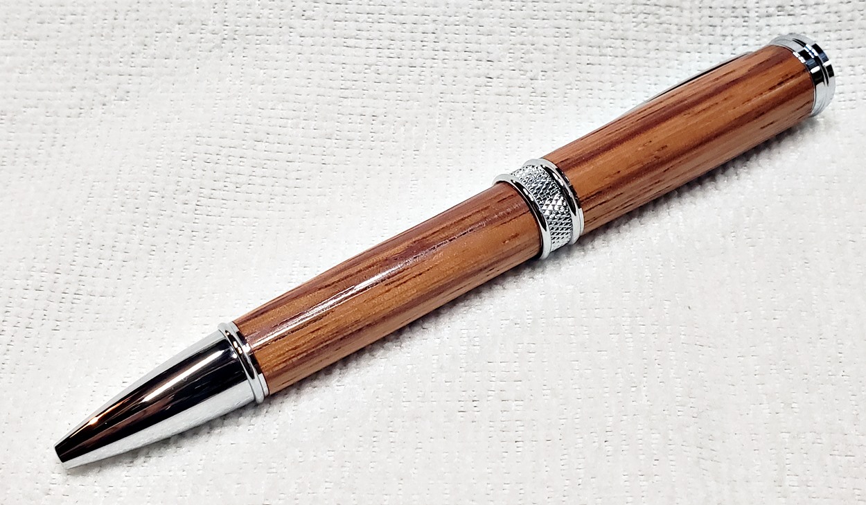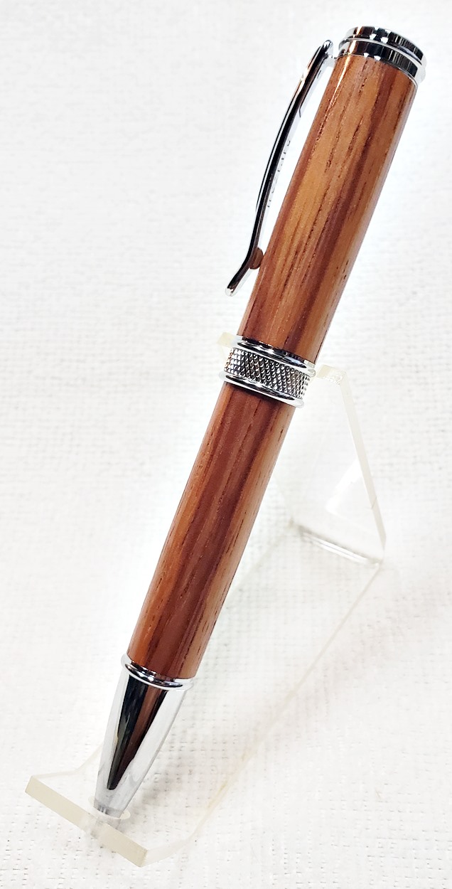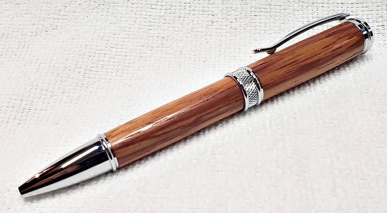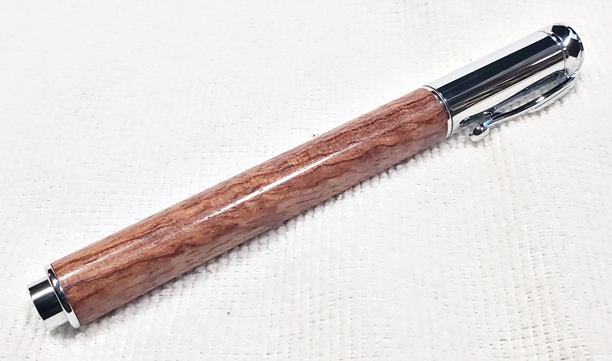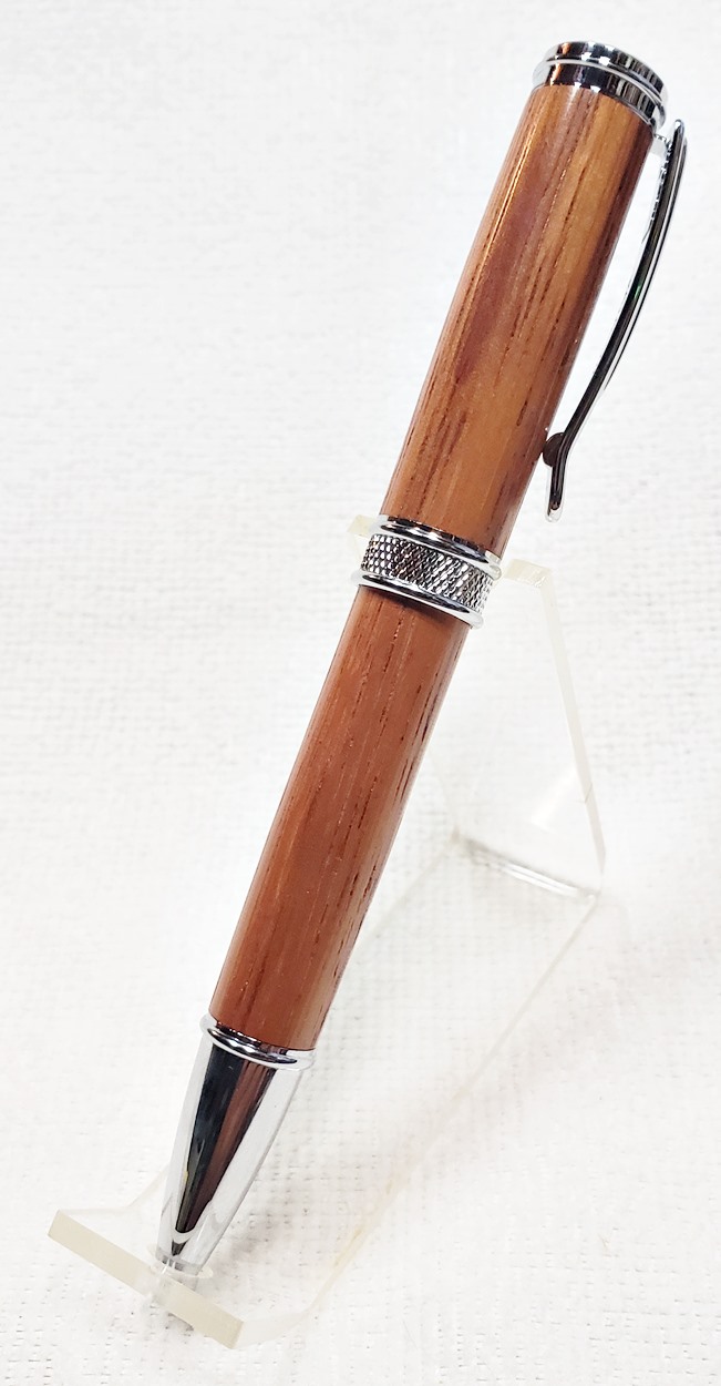This is a new pen for me, called Jr. Edward, in chrome. It's a very large twist ballpoint pen, and is from Crooked Mill. I love it! I like all the design details like the clip, finial, center band, and tip. And I really like the wood with it. The wood is unknown, but very pretty. It smelled kind of sweet when I was turning it, so some kind of fruit wood, maybe? I'm keeping this one for myself! (I need another pen!)
