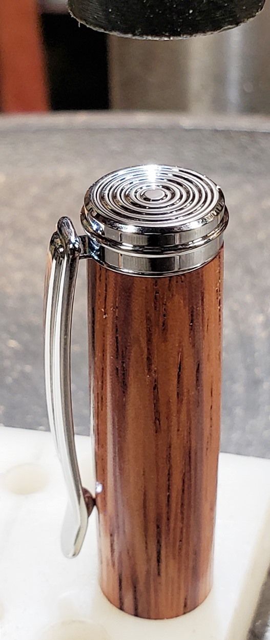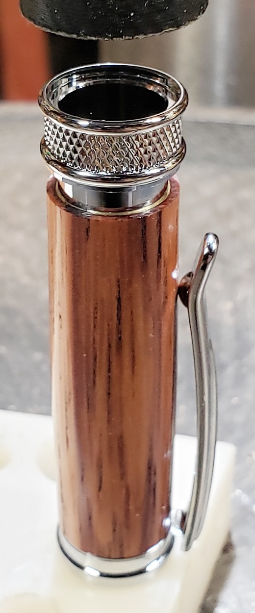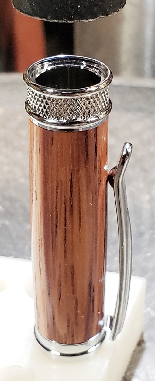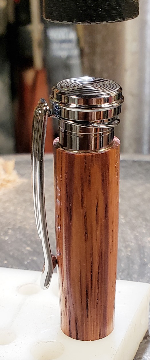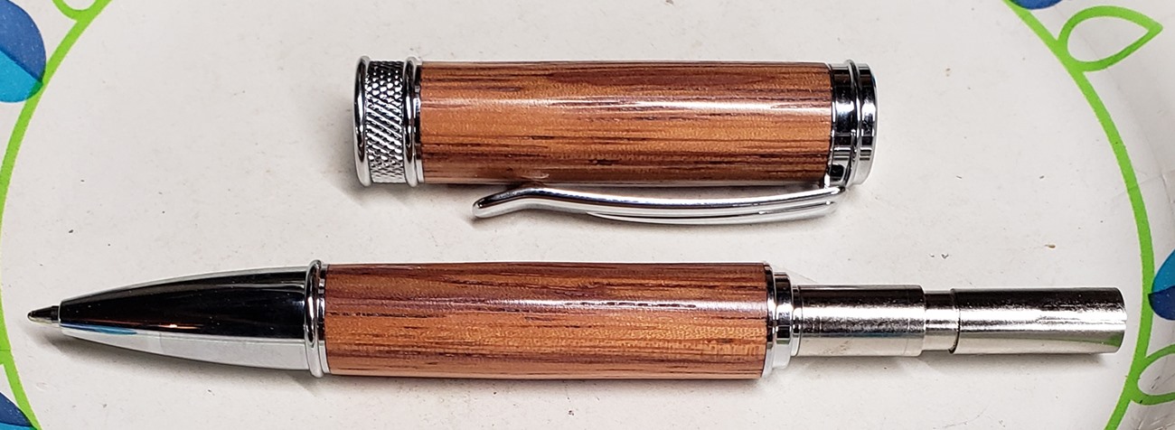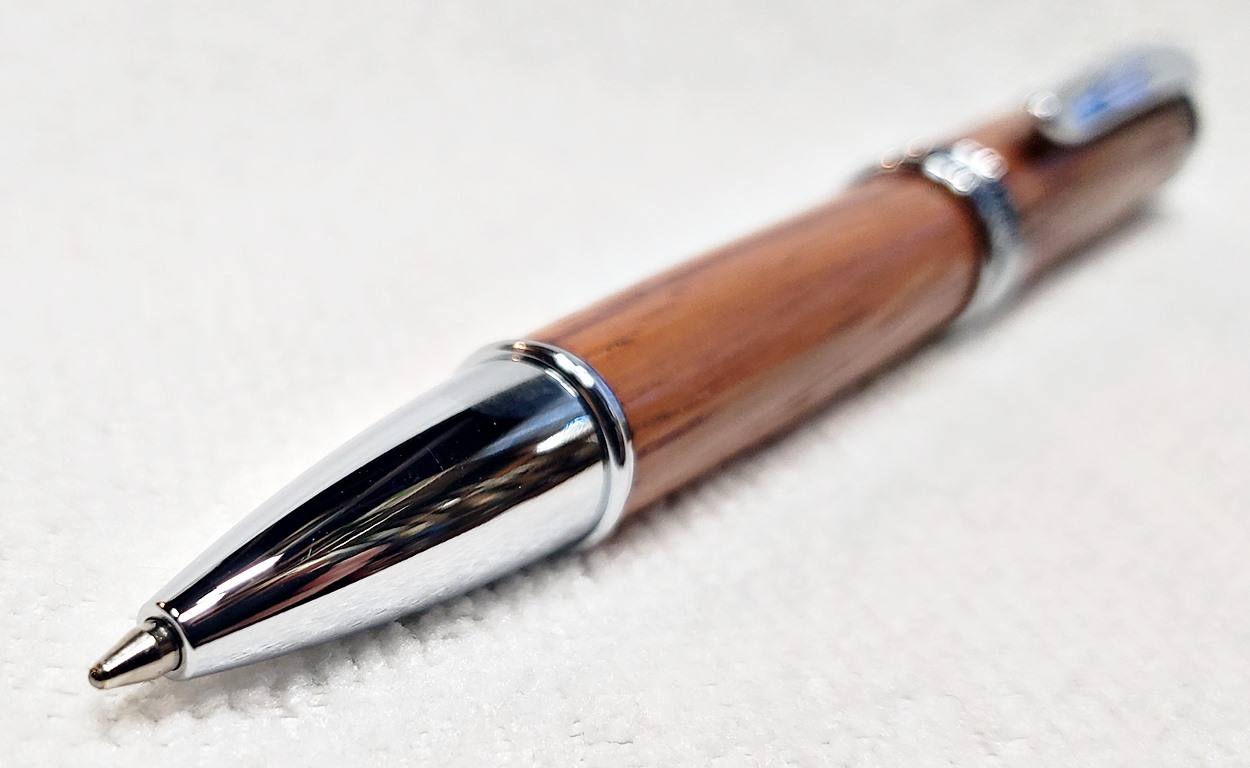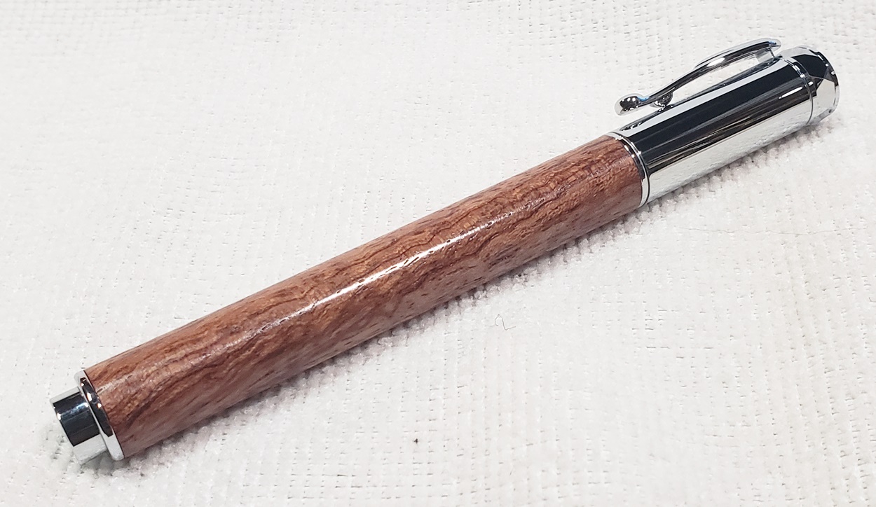 This is a new pen for me, called Jr. Edward, in chrome. It's a very large twist ballpoint pen, and is from Crooked Mill. I love it! I like all the design details like the clip, finial, center band, and tip. And I really like the wood with it. The wood is unknown, but very pretty. It smelled kind of sweet when I was turning it, so some kind of fruit wood, maybe? I'm keeping this one for myself! (I need another pen!)