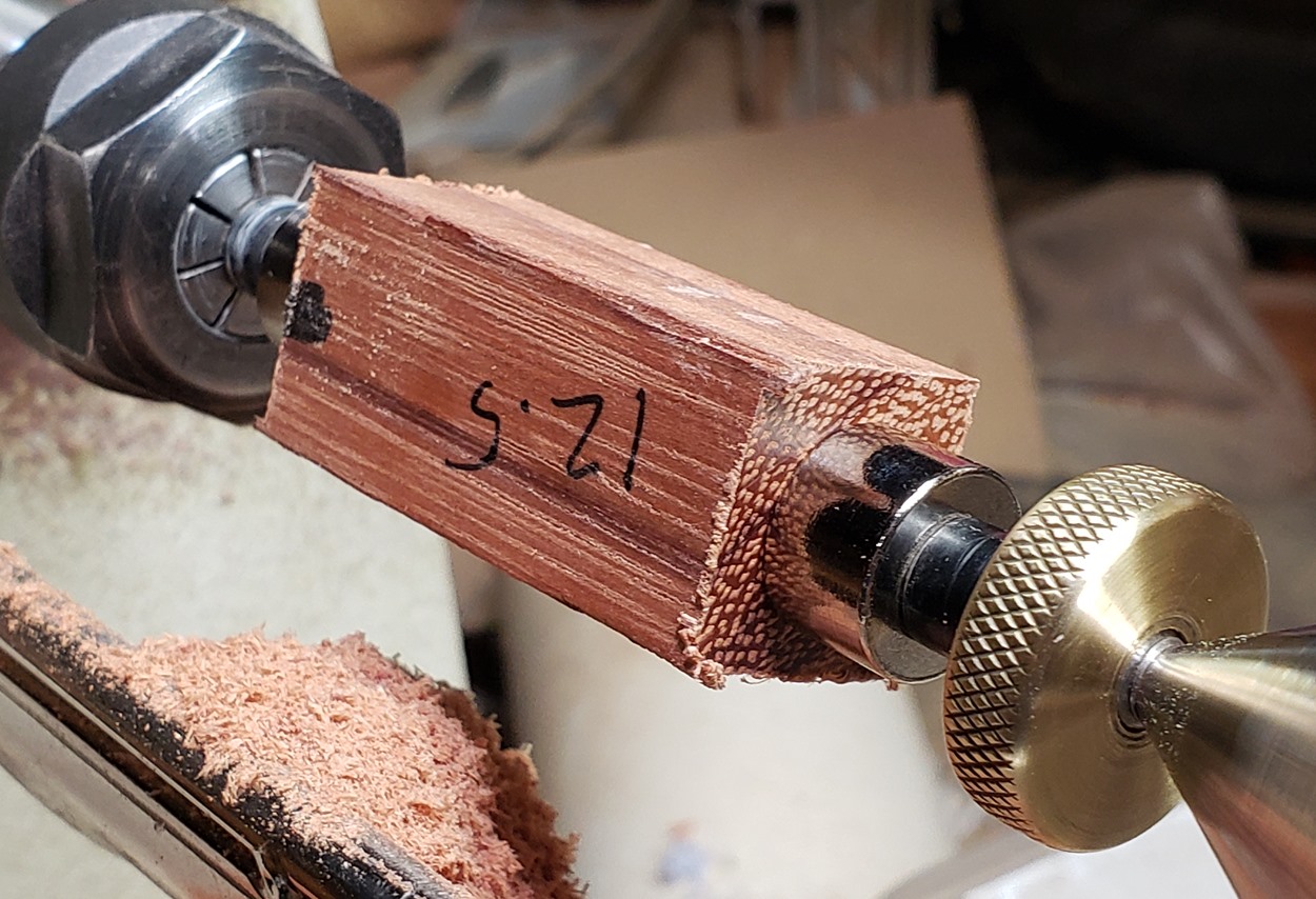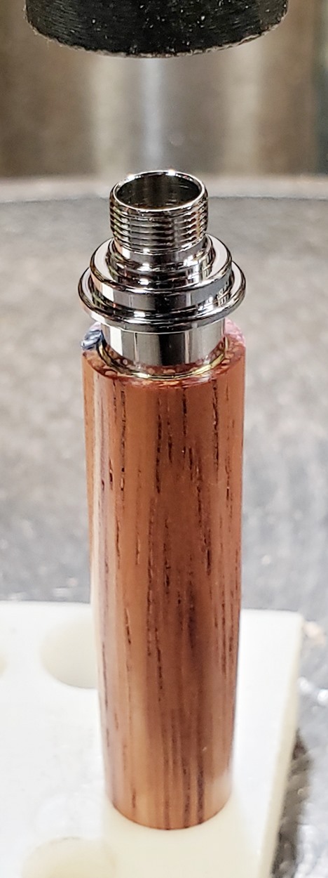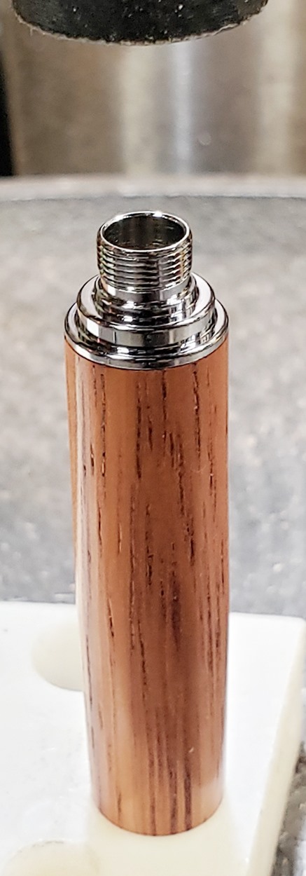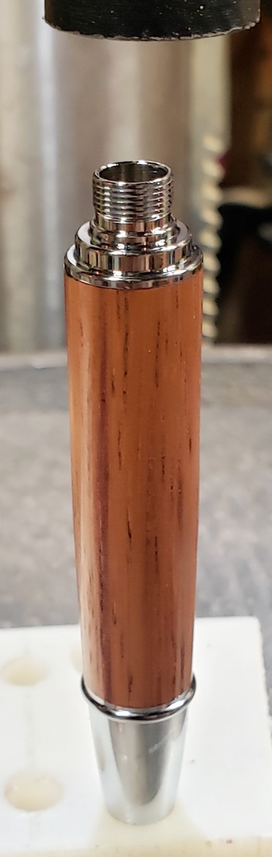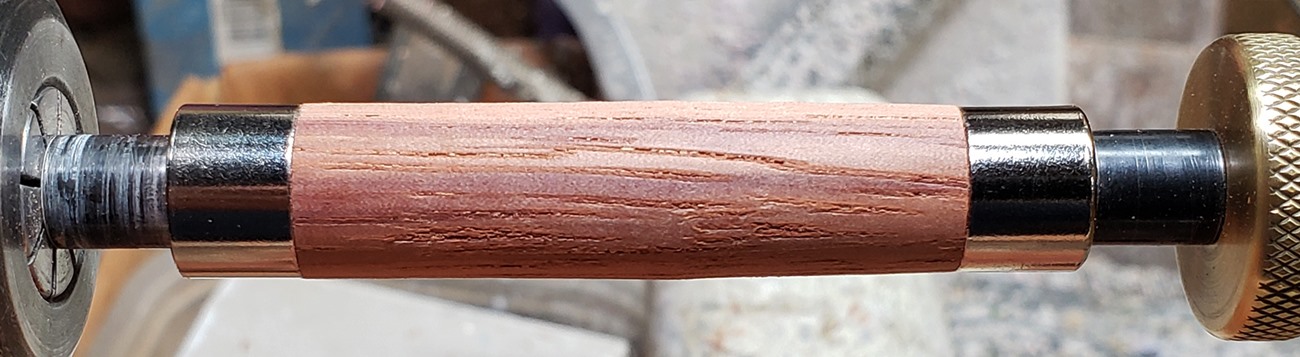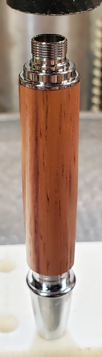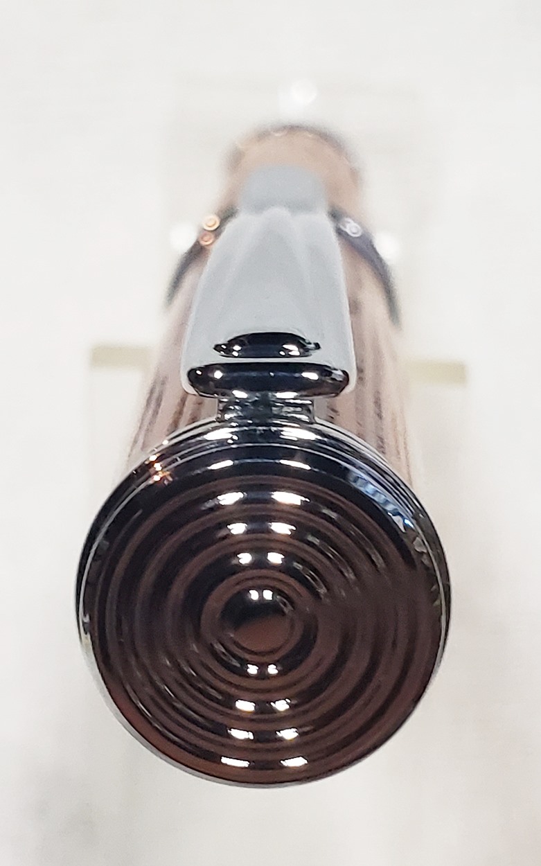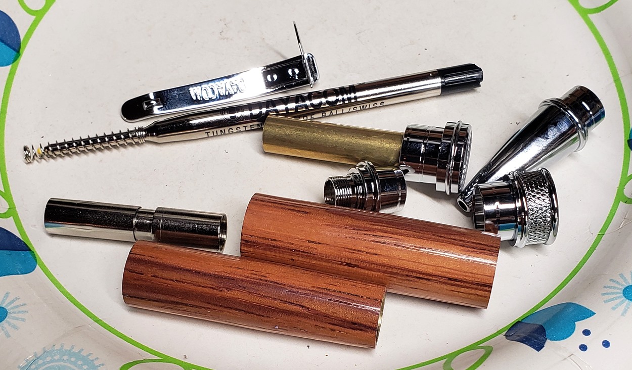 This is a new pen for me, called Jr. Edward, in chrome. It's a very large twist ballpoint pen, and is from Crooked Mill. I love it! I like all the design details like the clip, finial, center band, and tip. And I really like the wood with it. The wood is unknown, but very pretty. It smelled kind of sweet when I was turning it, so some kind of fruit wood, maybe? I'm keeping this one for myself! (I need another pen!)