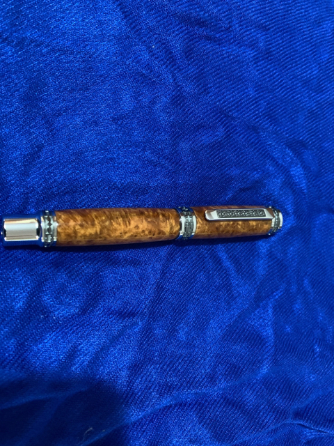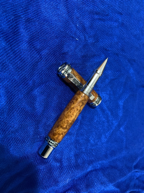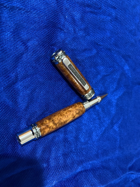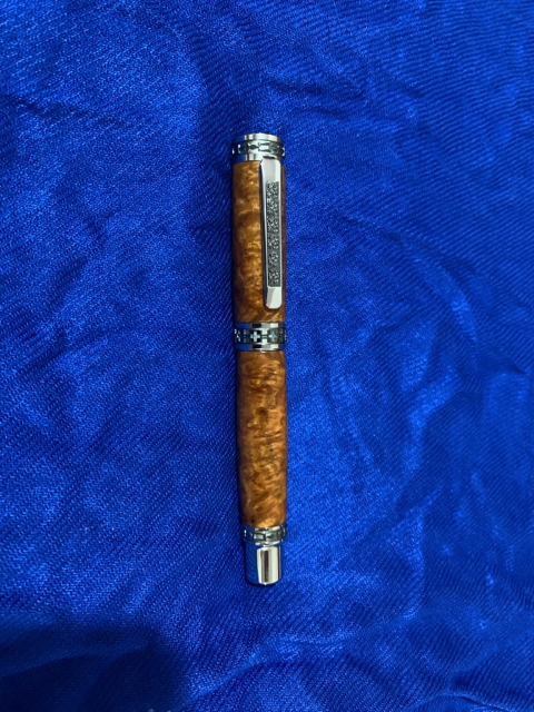 It is a Jr. Emperor paired with Golden Amboyna Burl. Finished with 12 coats of Cyanoacrylate and polished to a mirror finish.