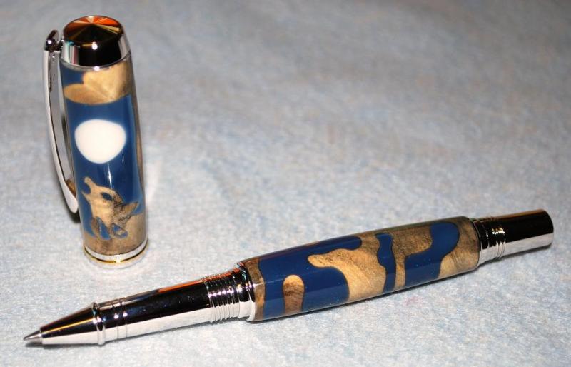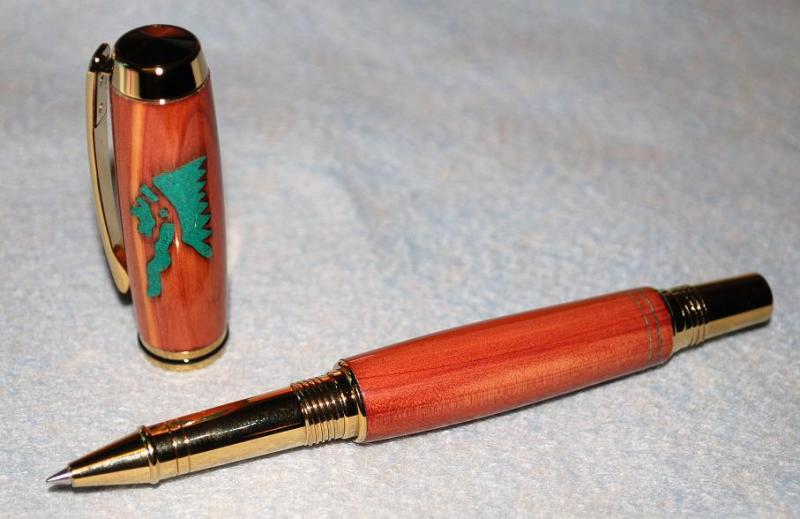These are my execution of Jeff's (workingforwood) handmade blanks. They are both Jr. Gent's. One is the howing wolf of buckeye burl and resin with a Rhodium kit, and the other is the Chief in cedar with turquois powder on a Gold Ti kit. They turned great with some needed patients and sharp tools. Finished with a few coats of thin CA and 6 coats of lacquer and buffed. Over all, I loved them. Great Blanks Jeff.