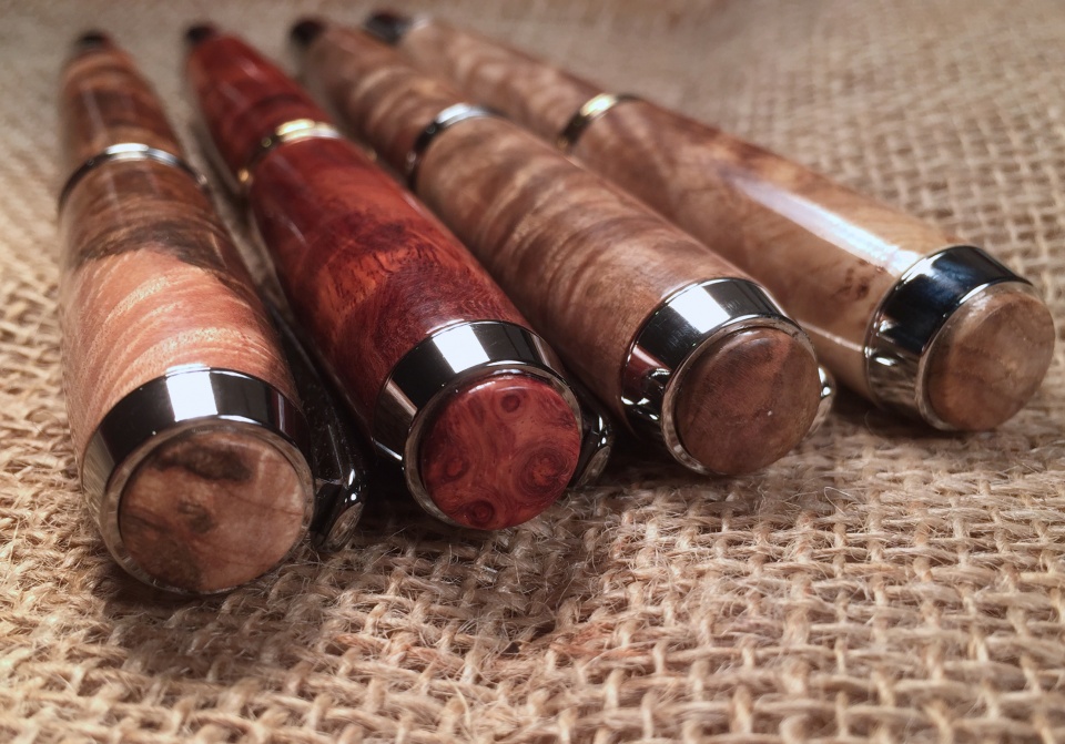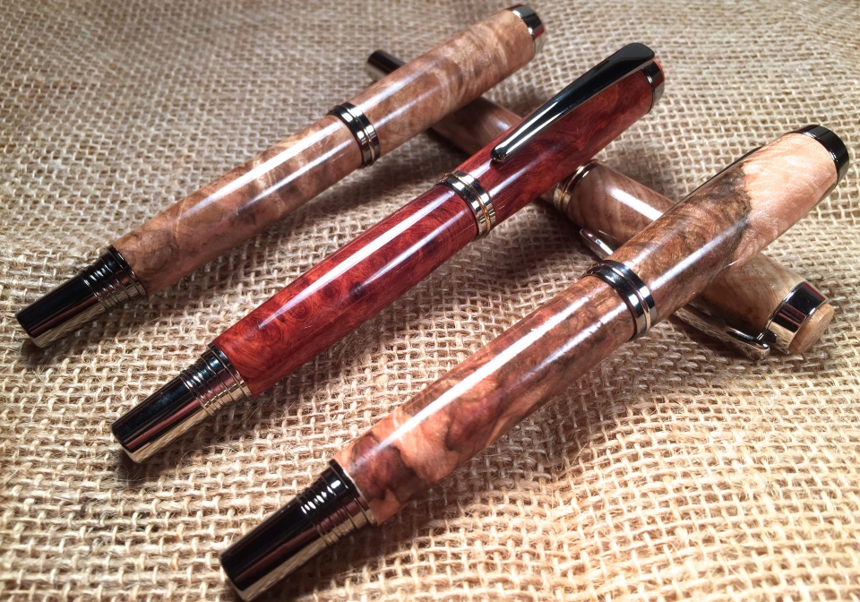 My recent back surgery brought me a really great customer....My Neurosurgeon. Can't say the surgery is worth the sales, but he's been keeping me busy. Here are 4 Jr. Gents he ordered in various burl(Rhodium/Maple, Rhodium/Black Ash, Rhodium/Amboyna, Black Ti/Sugar Maple). All burl cut by me except for the Amboyna. Finish is Craft Coat.
