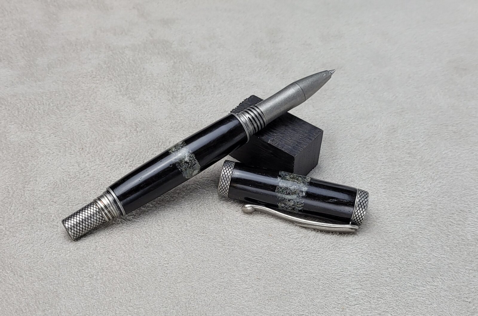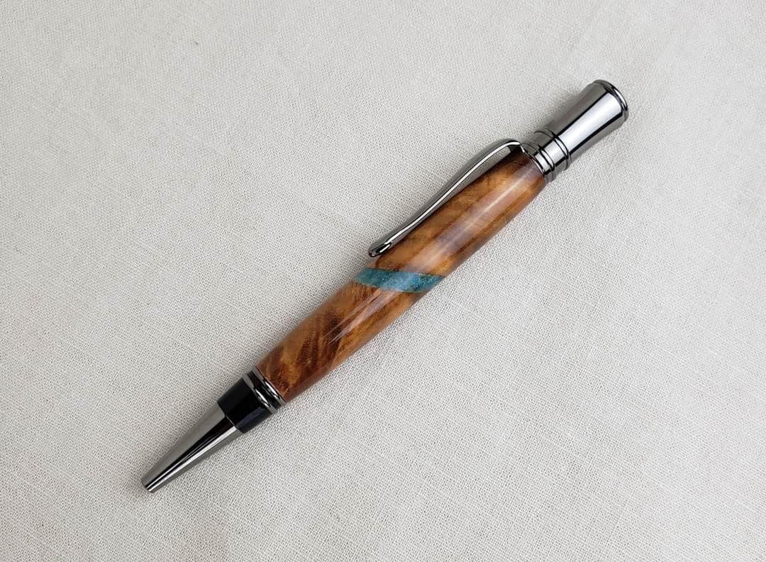 Please tell me what you think of the finish on this. I purposely didn't level off the glue in the deeper pores of wood grain, wanting to leave it a little more rustic looking, and tried for a medium sheen on the end product. I may even hit it again with one level coarser MM, but I also don't want to mess anything up since it went together well after a fixing where the CA finish separated on the end of the main barrel. That's why the grain doesn't "come through" as much on the main barrel as on the cap.