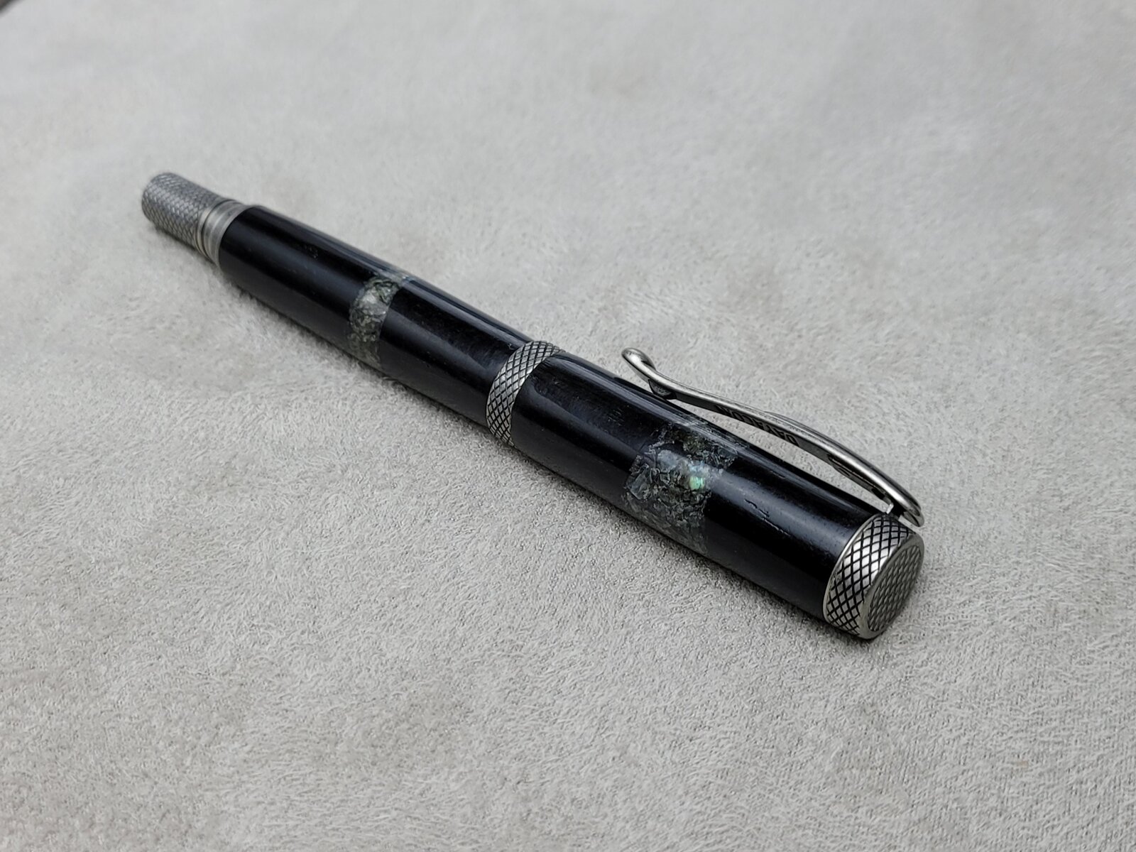 This is a Jr. Milton in antique silver, done in bog oak with labradorite inlay. The labradorite has some variating color flash when the light hits it just right, but doesn't pop like the cultured opal that is popular for rings right now.