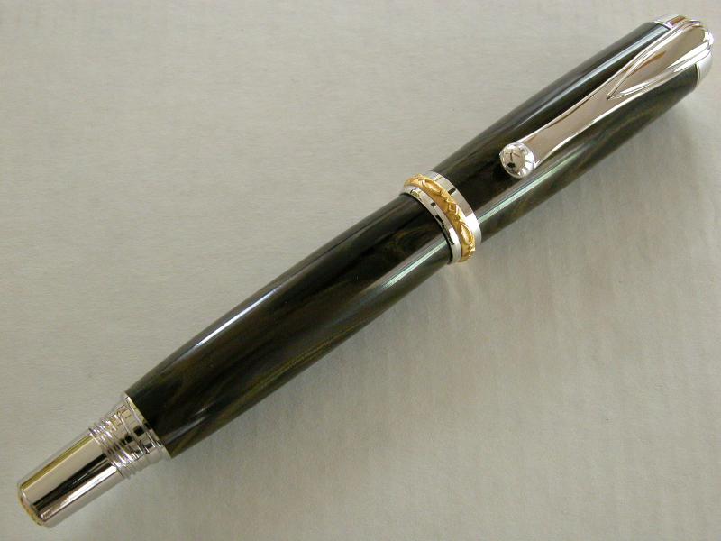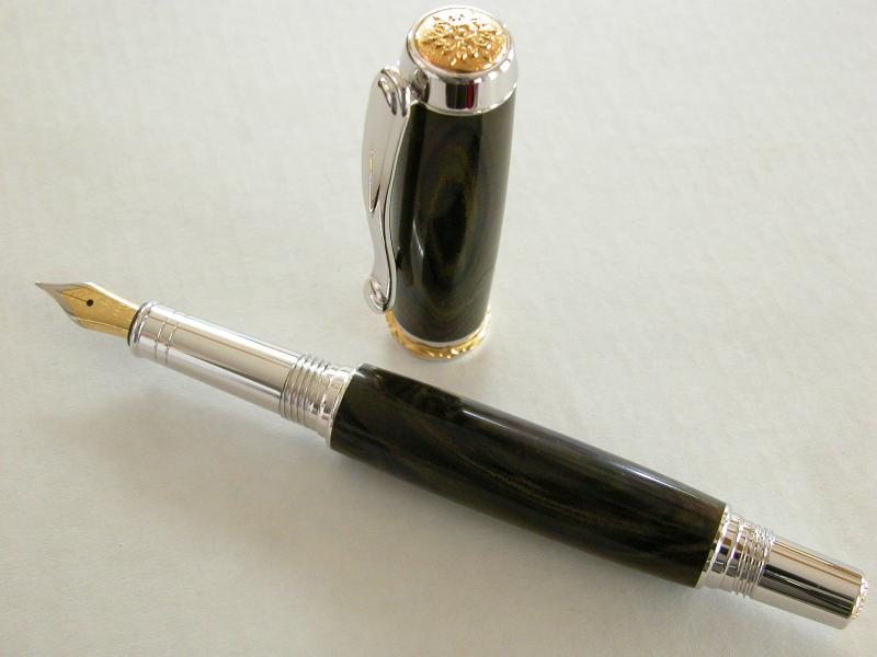 This is a black with yellow swirl ebonite fitted on a Jr. Statesman fountian pen kit. Keith "mrburls"