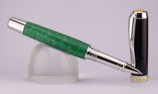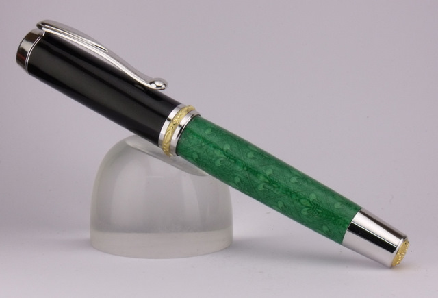 I got this Fleur De Cav Sierra blank from Charlie ( thanks Buddy:biggrin: ) and 'modded' it slightly to fit a Jr Statesman. I was going to attempt to paint the highlights gold, but LOML said there was enough contrast between the greens and to leave it alone in case I messed it up.