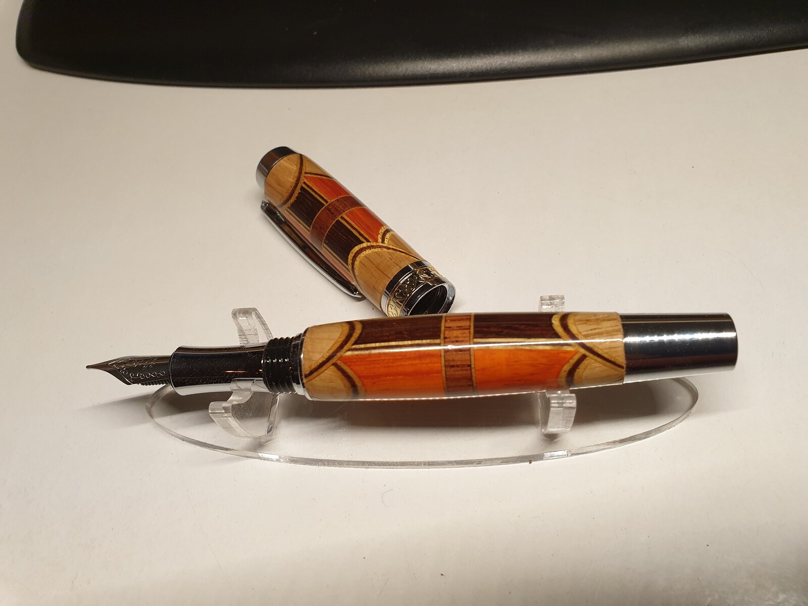 On request i made a fountain pen, Jr. Gentleman, a big boy!! Wenge, merbau, padouk and oak, 2 veneers. CA finish.