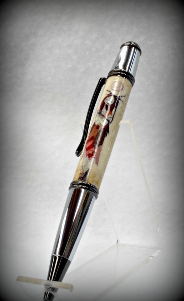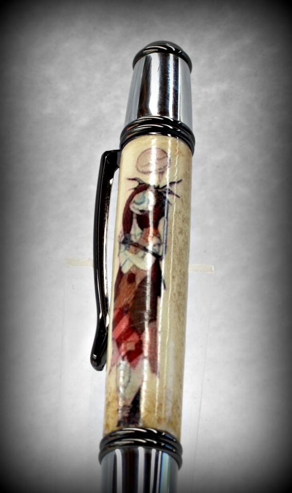 I believe his stage name at that time was just John Cougar. He brought in Mellencamp (his real name I guess) later on. Is that antler and painting? It is a sweet pen..