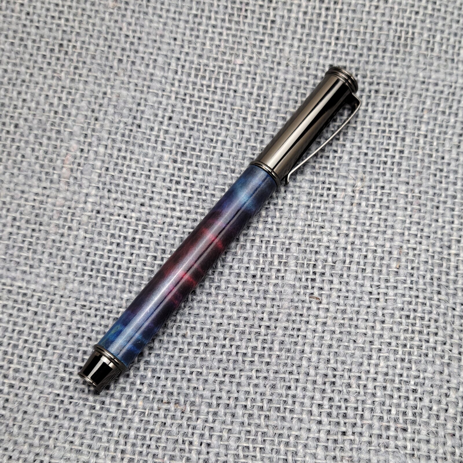Despite squaring it off again to get the CA buildup off the ends of the blank as I usually do, I just couldn't get that nib section to seat against the barrel and didn't want to ruin it by pressing harder. Anyway, I'm not going to let it bother me. Really just showing you all the finish. I need some more curly maple. It takes dye really well.