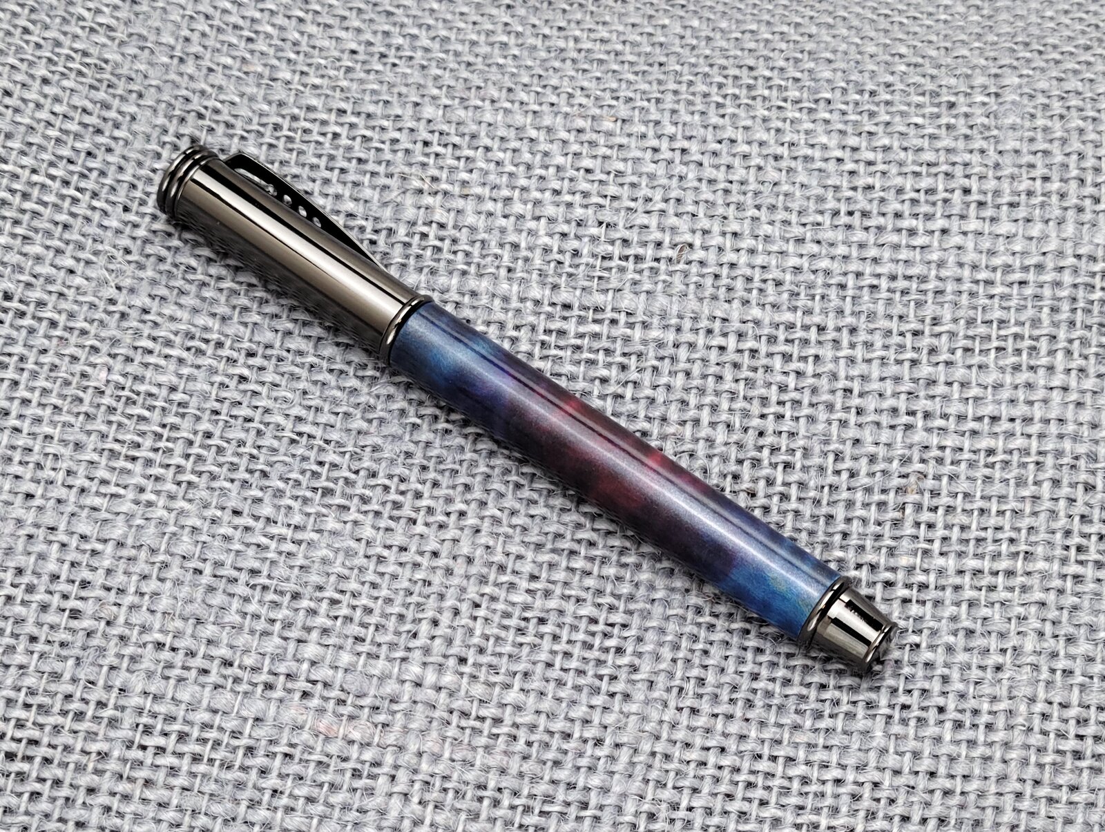 I thought the dye and mica finish came out really cool. The mica has a gunmetal color to it, so it looks pretty good with the gunmetal hardware, a little darker than this under normal indoor lighting. This is curly soft maple with several liberally applied layers of Keda dye. Finished with a couple layers of GluBoost medium with mica sprinkled on, then a couple layers of thin.