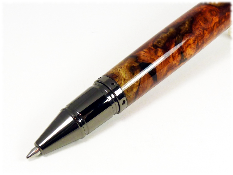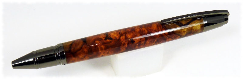 Have had this stick of Amboyna Burl for some time waiting for the right kit. Woodcraft started carrying the Accord Pen about 2 months ago or so and I liked it due to the 3 1/2" blank size...bought the Gunmetal version and turned the Amboyna for it. CA finish, MM to 12,000, Polished with PlastX. I like the pen as it is fairly simple but has good lines and balance, but it really shows of whatever blank you put in it. Comments welcome.--Rich
