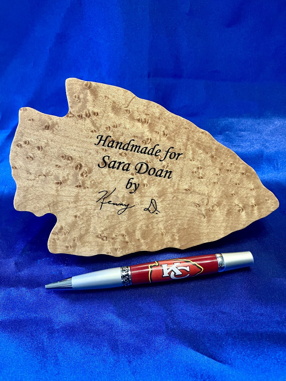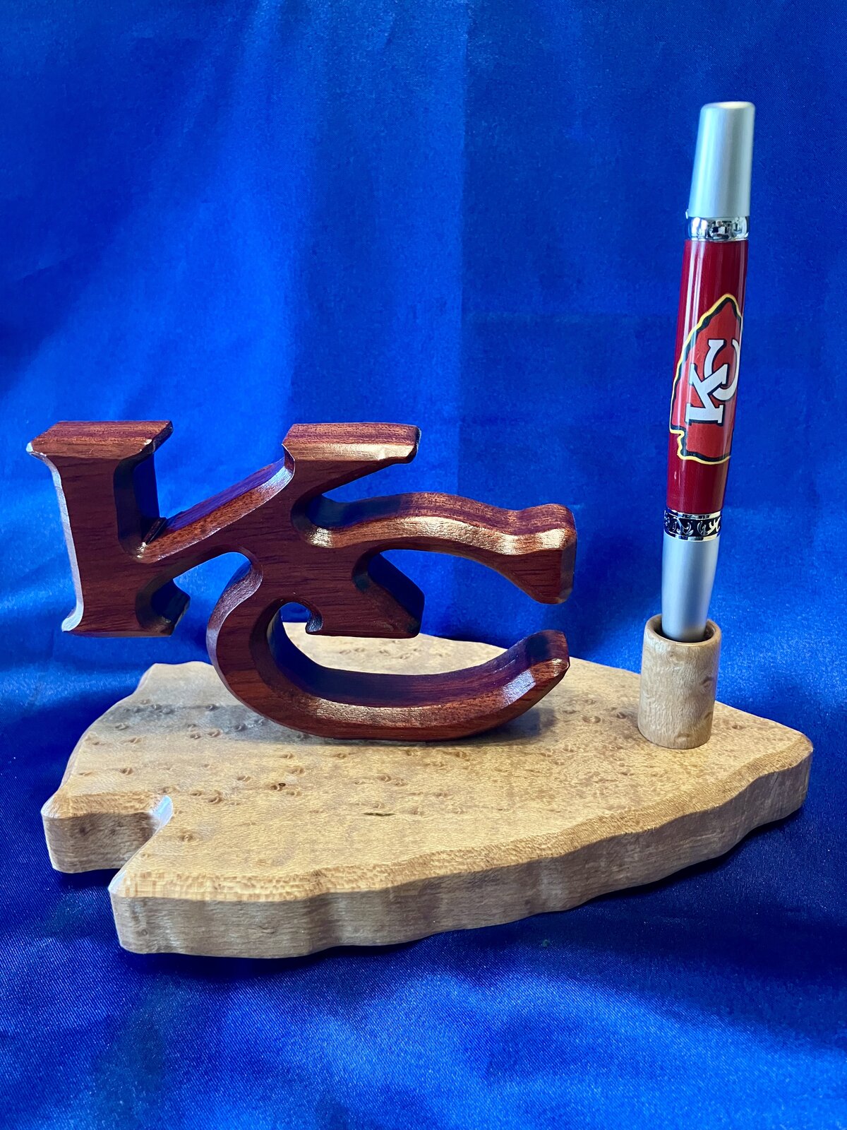 A friend asked if I could make a KCC pen. I said sure. I helped another friend make several for his grandkids and son in law. The pen was much easier than the stand. The pen is a vinyl logo on cloth. The stands base is Birdseye Maple with the KC made of Bloodwood. My buddy has a 3D printing machine so he made the insert for the funnel. That is a huge timesaver. All that's needed is a small cup wit a 1/2" hole. I used the gold ones offered at several pen outlets and they're made for slimlines. The pen would wobble but as long as it's vertical it would stay put. Now I have inserts for the Sierra and EDCs. Just a thought if you into making stands. Questions and Comments Welcome.