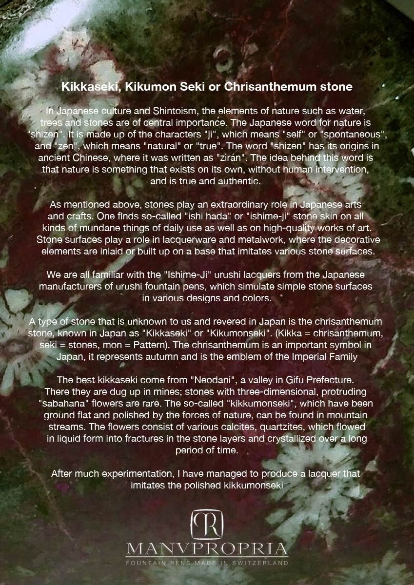 A type of stone that is unknown to us in the West and revered in Japan is the chrisanthemum stone, known in Japan as "Kikkaseki" or "Kikumonseki". (Kikka = chrisanthemum, seki = stones, mon = Pattern). The chrisanthemum is an important symbol in Japan, it represents autumn and is the emblem of the Imperial Family.