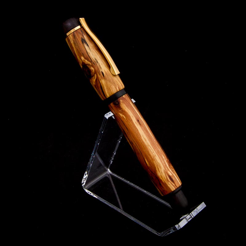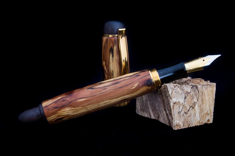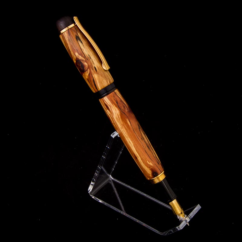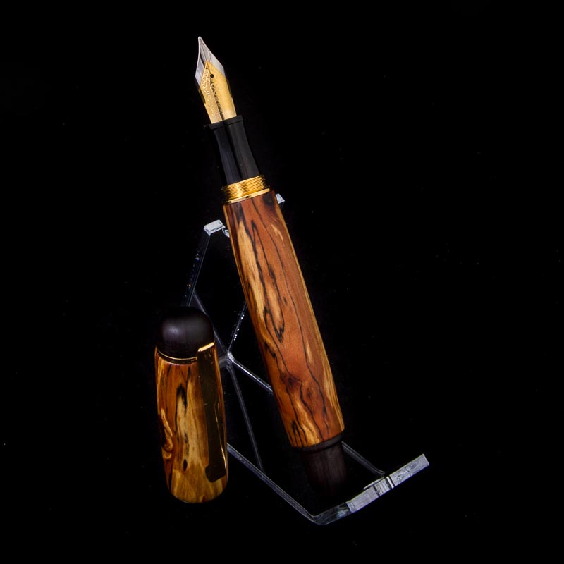 I like the Churchill Fountain kit on two personal taste issues - plastic nib (not metal) and it's press to post cap (no exposed threads). However, it's too dang heavy and I don't care for all the blingy trim rings. Here's my attempt at fixing those issues... which means I'm ditching the brass tubes, trim rings and metal finial and receiver, and just using the section, section threads, nib and clip. I epoxied things together. I used a piece of stabilized spalted Apple for the body and cap, and did the finial and receiver in African Blackwood. I finished it with Arrow Finish to try and maintain a wood feel.