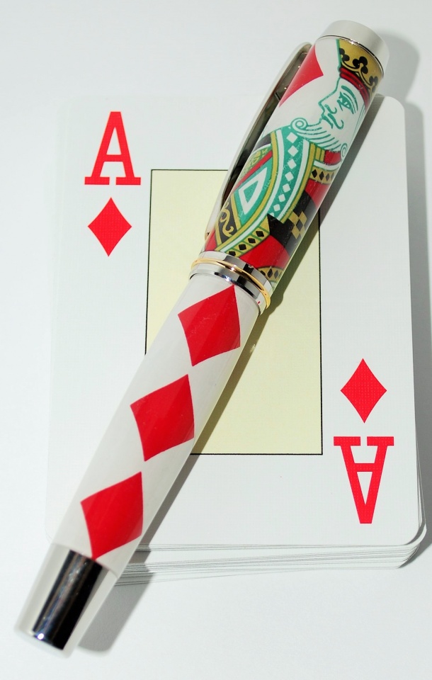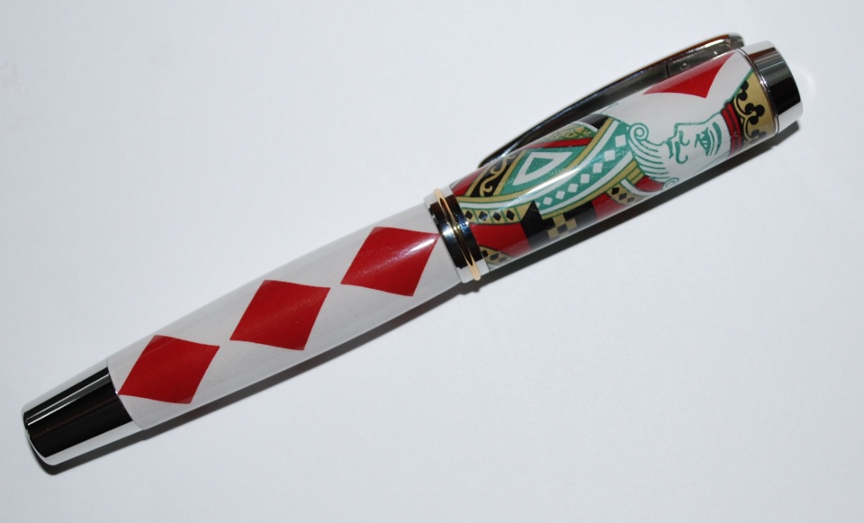 This is a pen and blanks I just finished for myself. I call it Cardistry. I've been playing around with playing cards a little and came up with this. The Jr II cap is the King and the lower is diamond face cards. There was a bit of a learning curve but it was fun. All comments welcome. Thanks!