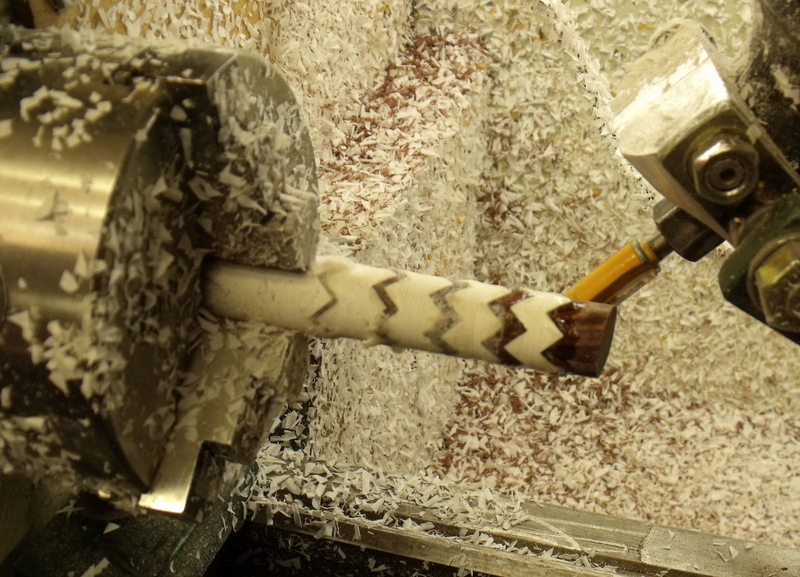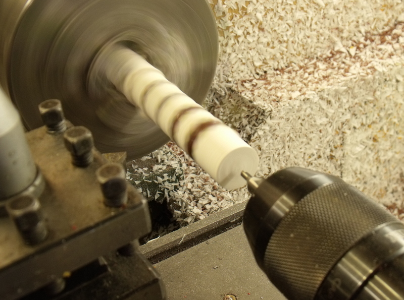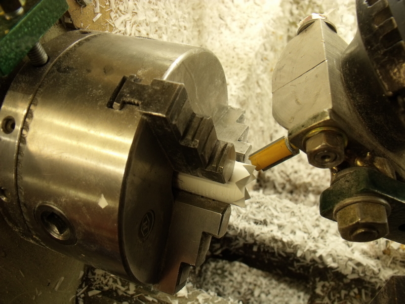 First I chuck up the long piece....then index cut the six vees and glue the next part on......rotate the leadscrew x turns and repeat.