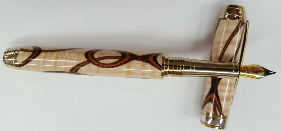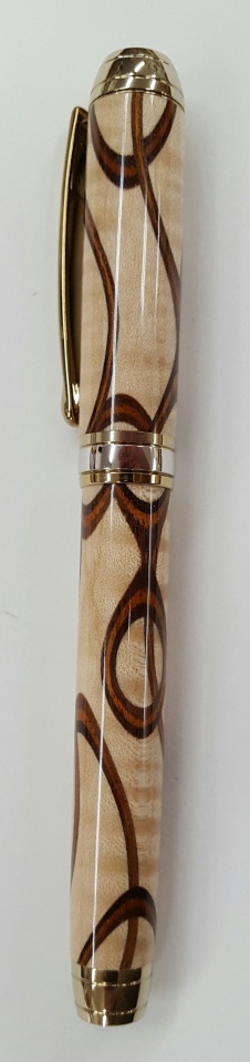 This kit is called Mistral. Its only available in the UK. It comes in rollerball & fountain. The blank is one of my new triple veneer serpentines. Curly Maple with Ebony & Mahogany. This is going to be my new personal pen.