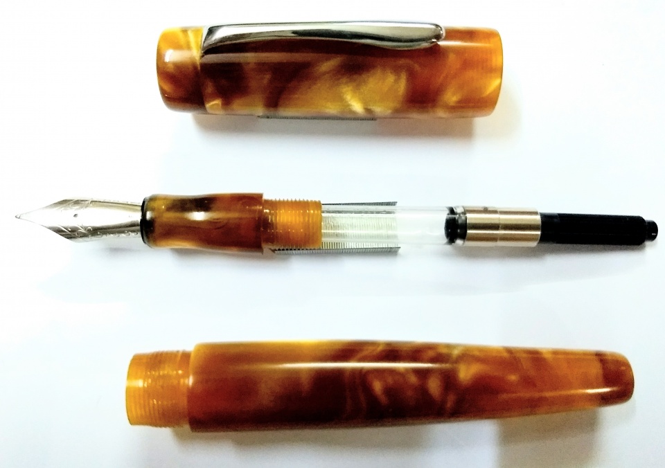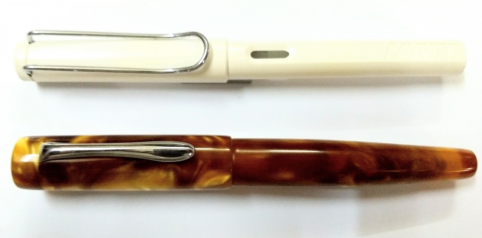 Jowo 6 fine nib unit and Schmidt K5 converter used. Shown a size comparison with a Lamy Safari.