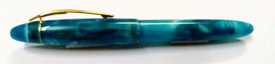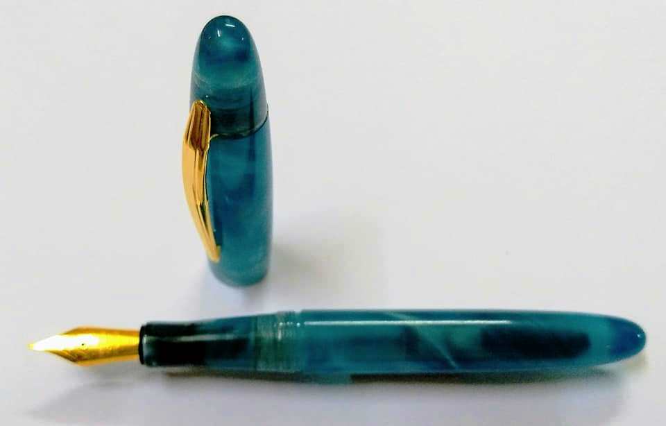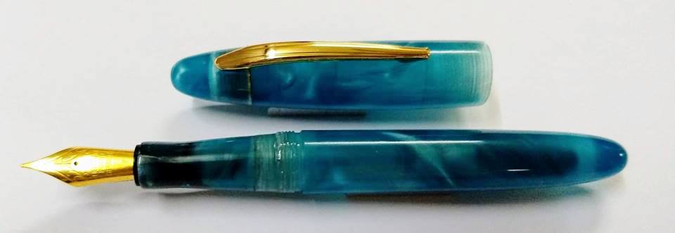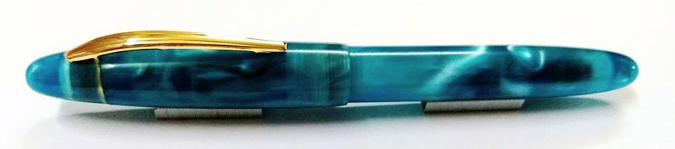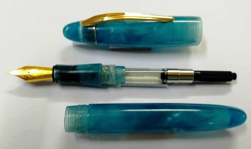 Completed this pen just now. Teal swirl acrylic in gold clip and nib. The pen had damage in the earlier 0.6 mm pitch thread, re-made the threads using clear acrylic insert rings. cap finial sits from outside on extension of the cap. Jowo 6 fine nib and Schmidt k5 converter. The clip ring is still visible, not the best fitment of clip. I like the shade of the blank, not too flashy for an acrylic blank. The cap is slightly longer in proportion to the barrel. ... Hope you like the design.