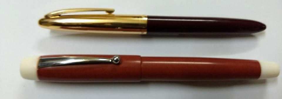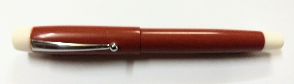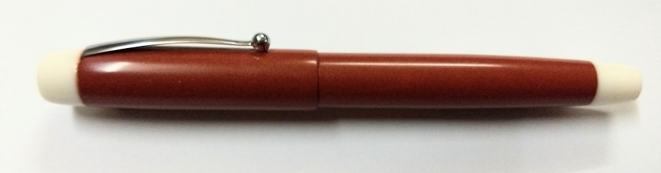 This afternoon I completed this pen in deep pink ebonite with white pmma end pieces. The section is a new type, attempted as a new try. Checked, the grip is satisfactory. Jowo 6 nib unit and Schmidt k5 converter. The last photo is for size comparison with a WingSung 233. The pen is made cap-posting friendly.