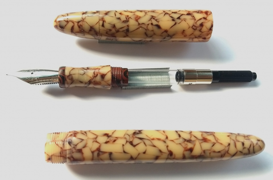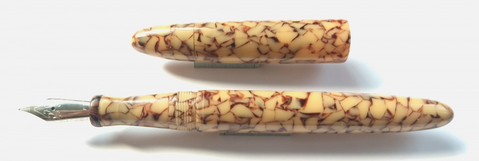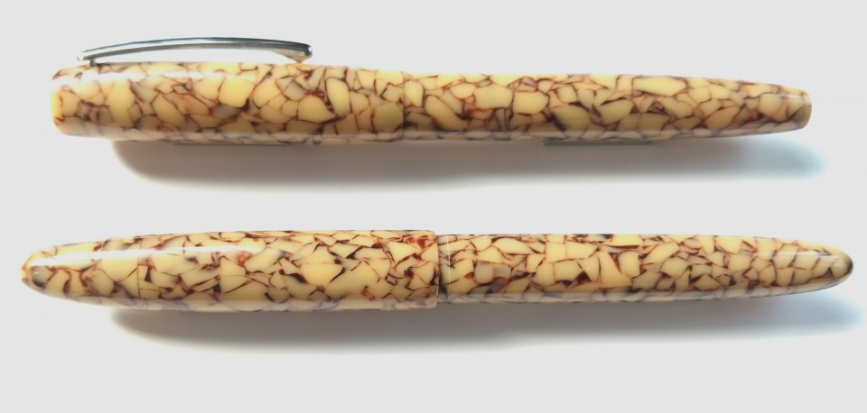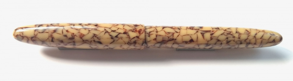 Made this clip-less pen last night. The granite acrylic material is very hard. Jowo 6 nib unit and Schmidt k5 converter. This pen is a long pen ,barrel ,14 mm max and cap 16 mm maxm. The section is made extra long for writing comfort., as a result the cap too needed more length. The pen is shown together with another pen made earlier using same material
